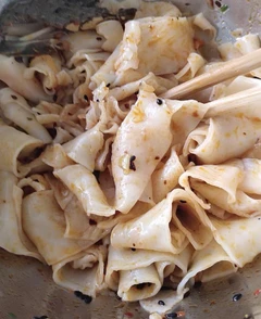 Chewy, broad-cut noodles made from wheat flour and tapioca starch for a satisfying texture.