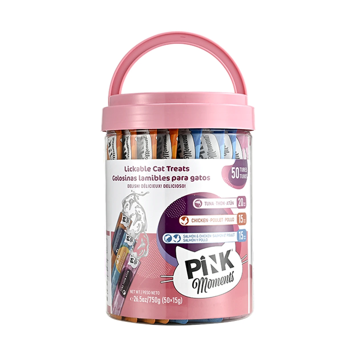 Product: PINK Soft Cat Puree SticksFlavors: Chicken 15 sticks / Salmon & Chicken 15 sticks / Tuna 20 sticks
