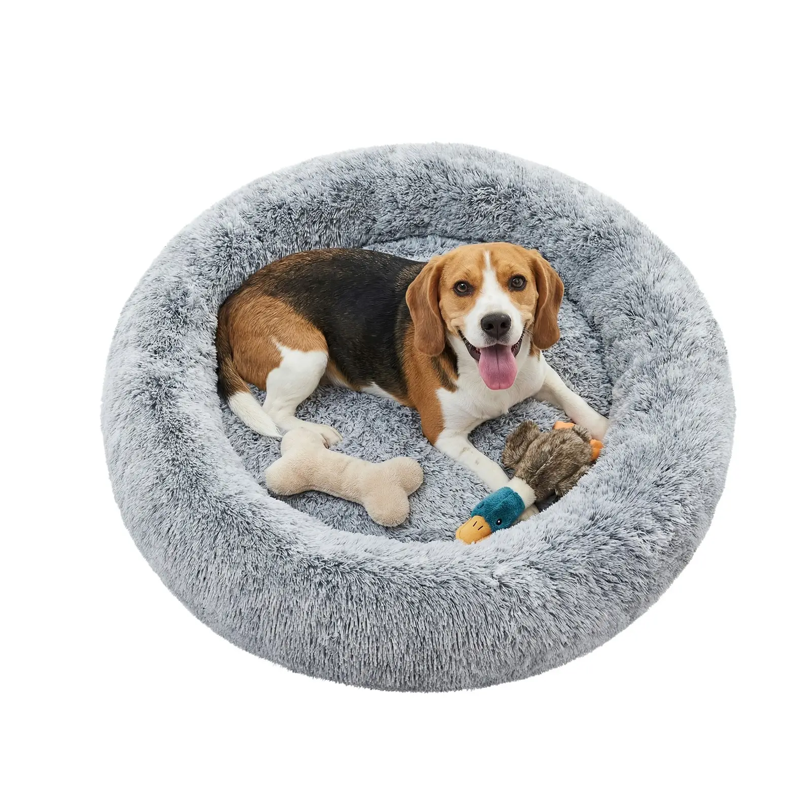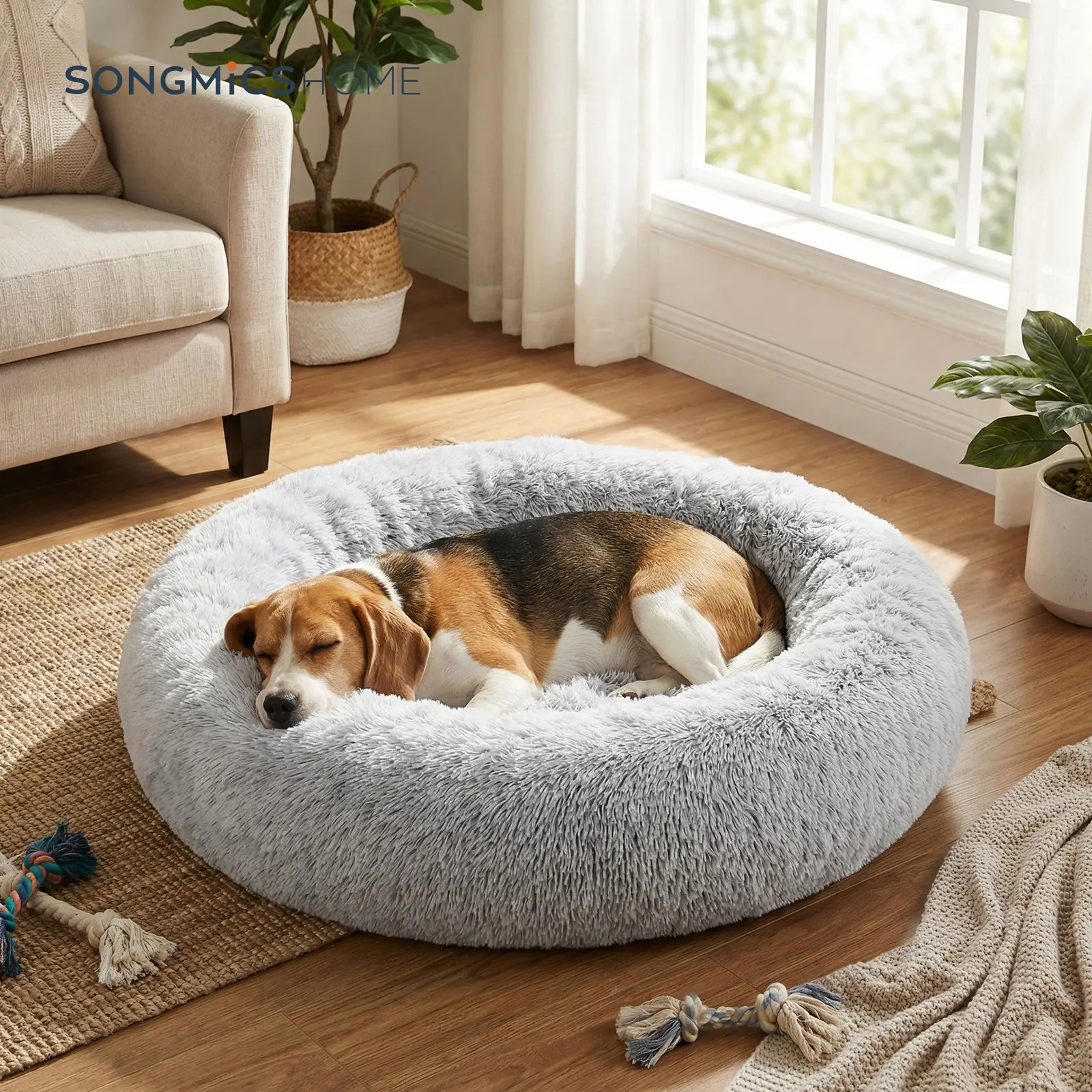 SONGMICS Fluffy Dog Bed, Cat Bed, Doughnut Cushion, Washable, Removable Padding in the Centre, Long Plush, 80 cm Diameter, Light Grey