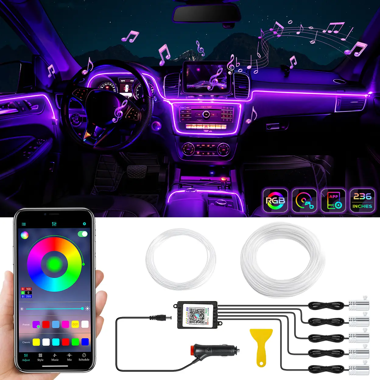 - 【Music Sensor】Built-in sound sensitive function, the car atmosphere light can sync any sound captured from microphone, then change colors following the music rhythm as well as your voice.