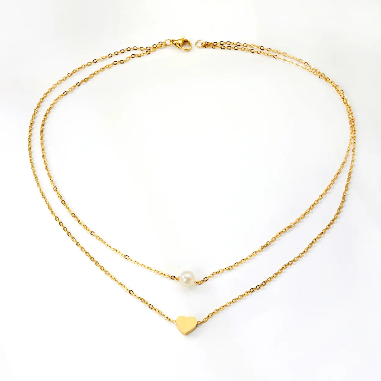 18K PVD Gold Stainless Steel Double Layered Necklace, Heart and Pearl Pendant Choker Set image 0