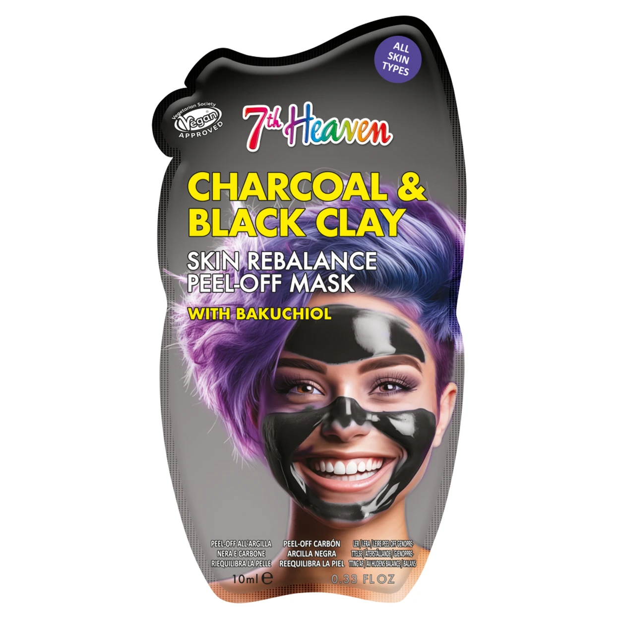 This product 7th Heaven Charcoal & Black Clay Skin Rebalance Peel-off Mask with Bakuchiol 10ml is used for deep pore purification and skin rebalancing at home. Give your skin a deep reset with this effective treatment that harnesses the purifying power of nature to draw out impurities, refine pores, and reveal a smoother, more balanced complexion. The combination of activated charcoal and natural black clay works like a magnet to absorb excess sebum and lift away pore-clogging impurities, while Bakuchiol and Witch Hazel help to soothe and refine skin texture. After the mask dries, simply peel it off to reveal skin that looks and feels visibly clearer, brighter, and rejuvenated. Detox and glow with our Charcoal & Black Clay mask. This blend cleanses pores, while Bakuchiol brightens skin, Witch Hazel rebalances and Vitamin E nourishes, leaving your complexion fresh and radiant.