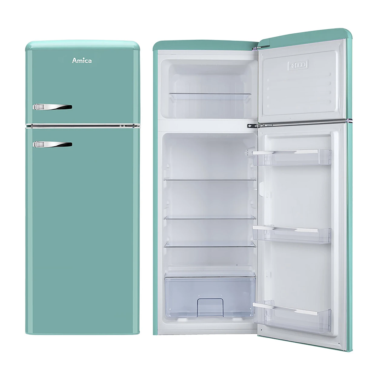 Amica FDR2213DB Retro Style Top Mount Fridge Freezer – Blue| 55cm Wide | 144cm High | E Energy Rated | Chrome Handles