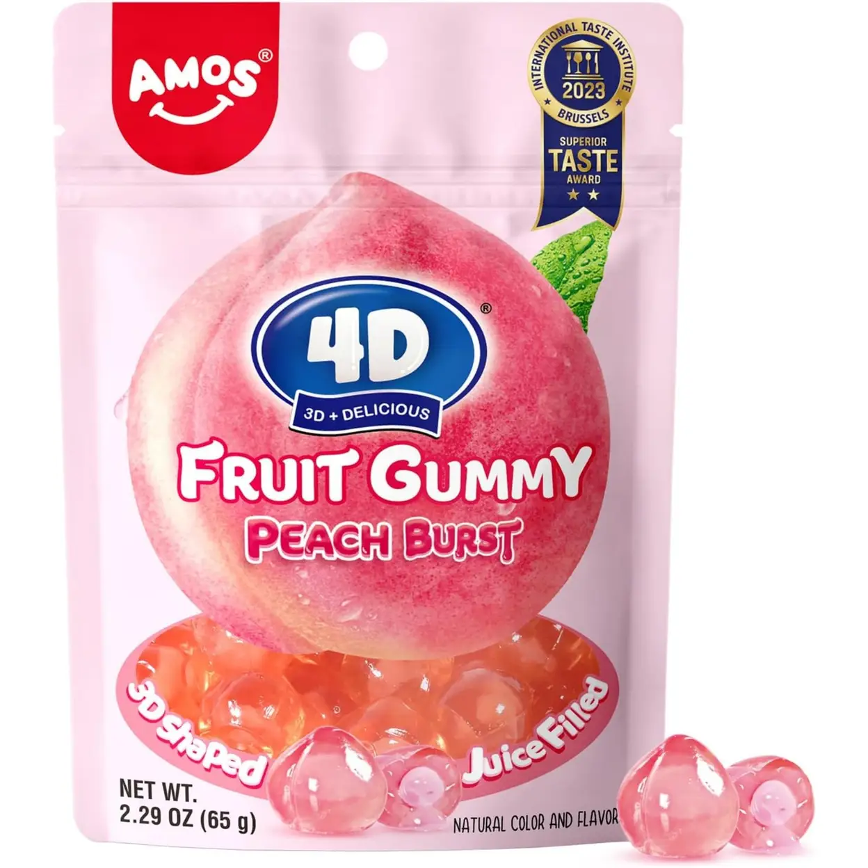 Indulge in the sweet, sun-ripened flavor of fresh peaches with Amos 4D Fruit Gummy Peach Burst, a wonderfully chewy gummy candy made with real peach juice for an authentic fruity taste. Molded into cute mini 3D peach shapes, each gummy has a 6.75% peach juice filling at its core that bursts with delicious flavor on every chew, crafting a delightful sensory experience for peach and candy lovers alike. Made with natural colors and flavors, this gluten-free, fat-free and cholesterol-free snack is a guilt-free treat, ideal for satisfying sweet cravings at home, on the go or while sharing with loved ones. Packaged in a handy 65g resealable peg bag, these gummies stay fresh and tasty, and also work perfectly as a fun decorative topping for desserts, cupcakes and yogurt. A standout treat from the award-winning Amos 4D range, this peach burst gummy redefines fruity candy with innovative design and premium, high-quality ingredients, bringing joyful, sweet moments to every bite.