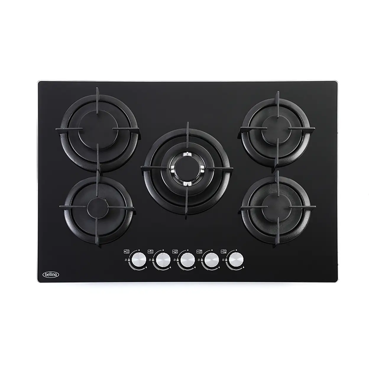 Belling GTG753RI BLK Gas Hob – 75 cm Black Glass, 5 Burners, Cast Iron Pan Supports, Multi-Point Ignition