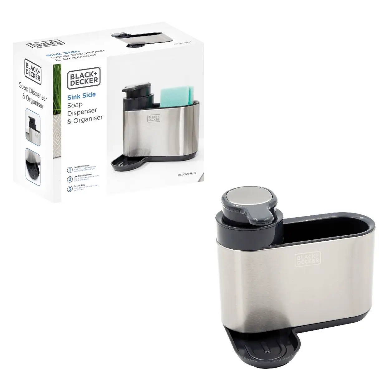 The BLACK + DECKER Sink Tidy with Dispenser in stainless steel is a practical and stylish solution for keeping kitchen sinks organised. It features compartments for sponges, brushes, and other cleaning tools, alongside a built-in liquid dispenser for dish soap or detergent. The stainless steel construction provides durability, resistance to rust, and a modern, sleek appearance that complements contemporary kitchens. Designed to fit neatly alongside the sink, it keeps cleaning essentials within easy reach while maintaining a clutter-free workspace. The removable components allow for effortless cleaning and maintenance, ensuring hygiene and longevity. Ideal for home cooks seeking both functionality and aesthetic appeal, this sink tidy simplifies kitchen organisation while enhancing efficiency during daily dishwashing routines.