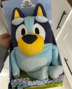 Bring the fun and imaginative play of Bluey home with the Talking Bluey 13-inch Sound Effects Plush. Bluey, the loveable six-year-old Blue Heeler dog who loves to turn everyday family life into endless playful adventures, comes to life in this interactive soft toy . Children can press Bluey's tummy to activate 9 different fun phrases straight from the hit TV show, including memorable lines that fans will instantly recognize . The plush also plays the Bluey theme song, encouraging sing-alongs and musical statue games . Made with premium soft deluxe fabrics and featuring detailed embroidered stitching, this talking plush is both durable and incredibly soft to hold . At approximately 13 inches tall, Bluey is perfectly sized for cuddles during showtime or storytime, and portable enough for children to take everywhere on their adventures . The plush doubles as both an interactive toy and a comforting companion, allowing children to recreate memorable moments from the show or invent new Bluey adventures with family and friends . Additional Bluey plush friends are available separately to expand the collection .