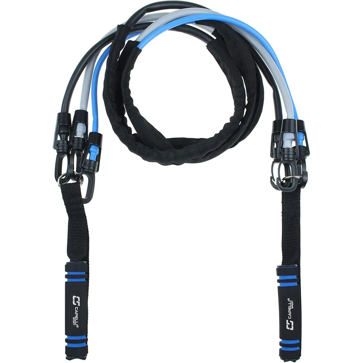 Attach the desired resistance band(s) to the foam handles using the easy-adjust clips. Ensure clips are securely fastened before use. Clean the bands and handles with a damp cloth after use. Store in a cool, dry place away from direct sunlight or sharp objects.