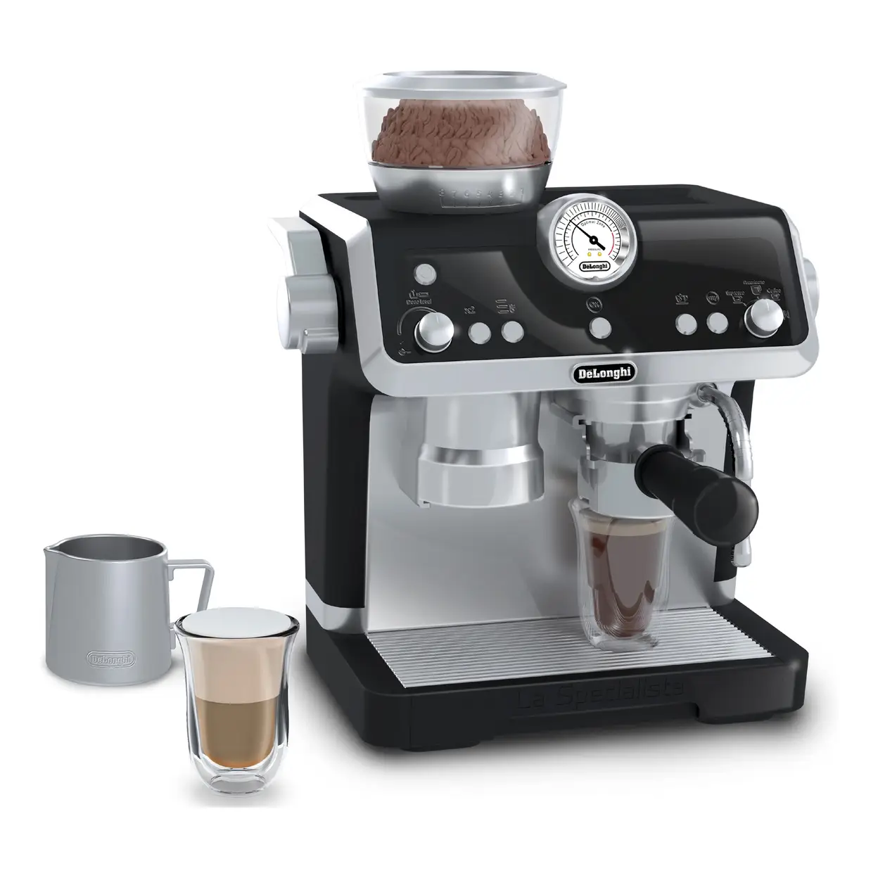 Delight your little one with the Casdon DeLonghi Barista Coffee Machine. This barista-style coffee machine is designed to look just like the DeLonghi La Specialista. With moving parts and realistic sounds, your little one will find great joy brewing up imaginary cups of coffee. Whether making an Americano or whipping up a frothy cappuccino, this set has everything needed to become a world-famous barista. The advanced toy coffee machine comes complete with realistic sounds and a magic coffee reveal, making it the perfect addition to any play kitchen. The machine is equipped with all the accessories your child needs, including a portafilter, two plastic cups, an Americano coffee pod, a cappuccino pod, and a milk jug. With working buttons for coordination and a realistic setup to develop social skills through play, there is more than meets the eye with this machine. With its charming design and fun features, the Casdon DeLonghi Barista Coffee Machine is sure to become your child's favorite toy.