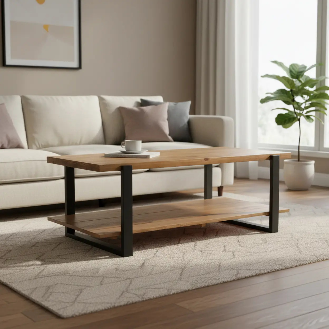 · Rustic Pine Wood Finish: Both the tabletop and lower shelf are made from thick wood, finished in a warm, natural wood tone that gives the table a charming, rustic appeal.