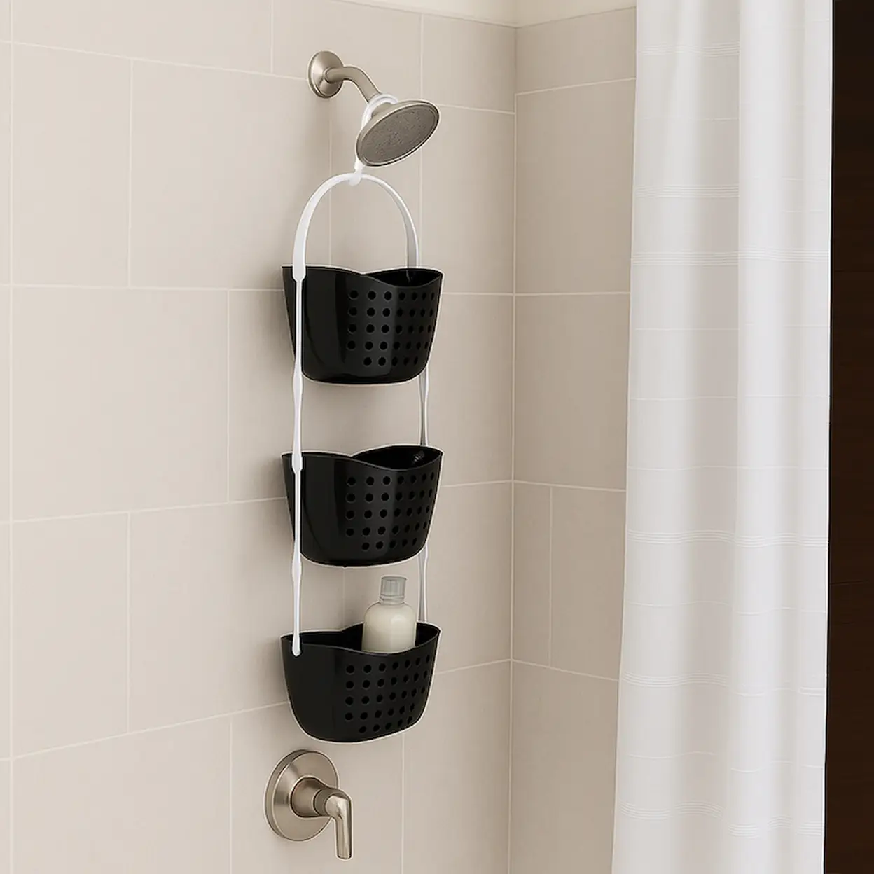 This quirky shower caddy is crafted from robust PP, ensuring long-lasting durability for everyday use. Its three-tier construction features rounded black baskets, providing ample storage space for your bathroom essentials. Each basket is designed with small holes to allow airflow, keeping contents dry and fresh. The curved hook handle makes it easy to hang the caddy in your shower or bathroom, while the monochrome design adds a modern touch to your space. Perfect for organizing toiletries and keeping your bathroom neat and stylish.