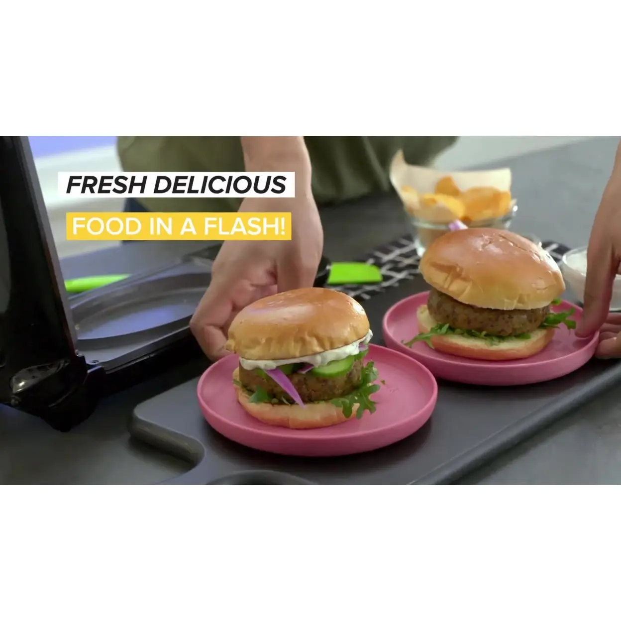 The easy to clean non-stick surface means that you can simply wipe it down with soapy water, and food slides off effortlessly. Its compact design ensures it fits on virtually any kitchen counter and folds away for easy storage. The simple red and green indicator lights show when you’re ready to cook—just close the lid and let it work.