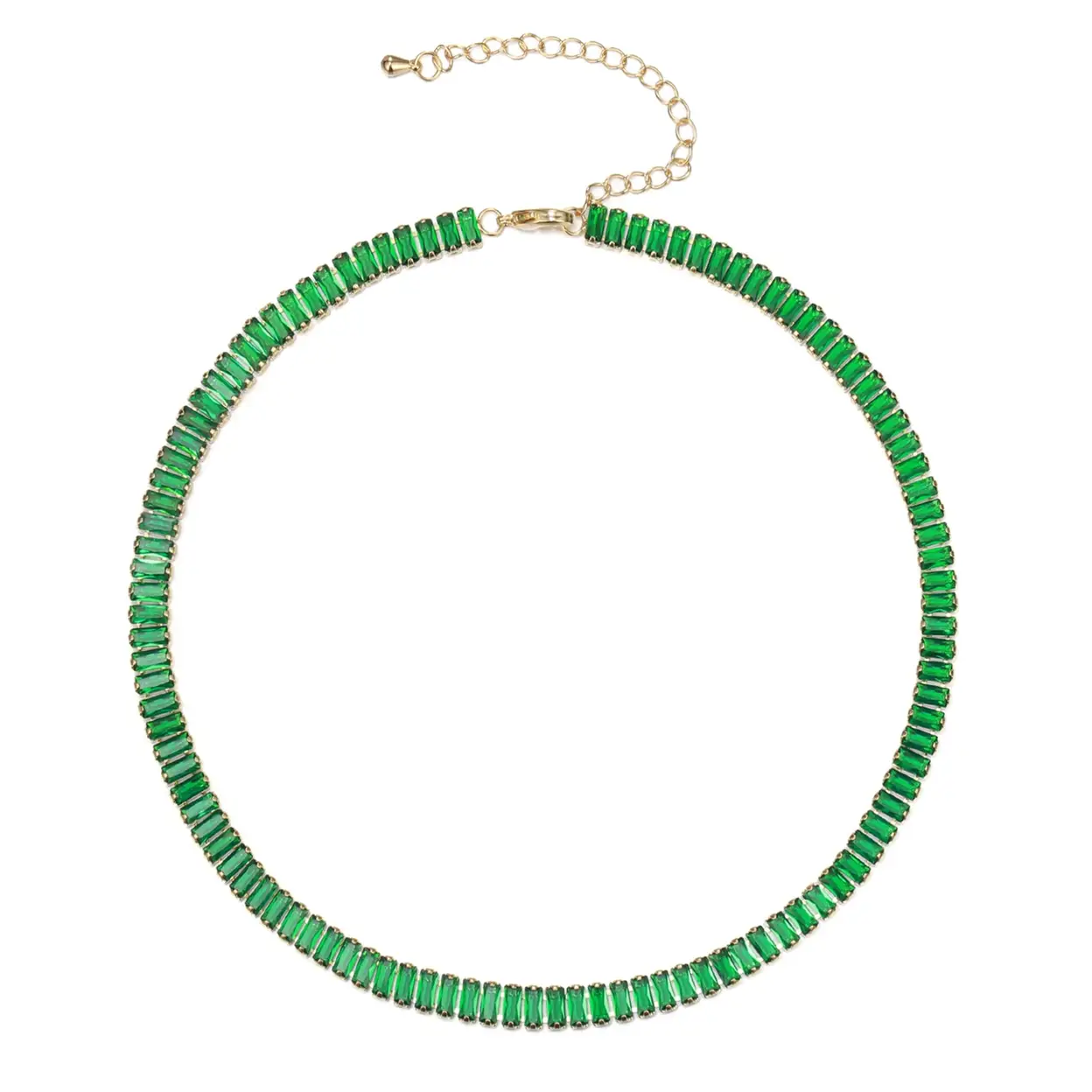 This Ever Faith choker necklace features a bold row of rich green stones, creating a striking and elegant statement. Its thick silhouette adds eye-catching sparkle, whether worn alone or layered with other styles for a glamorous layered look.