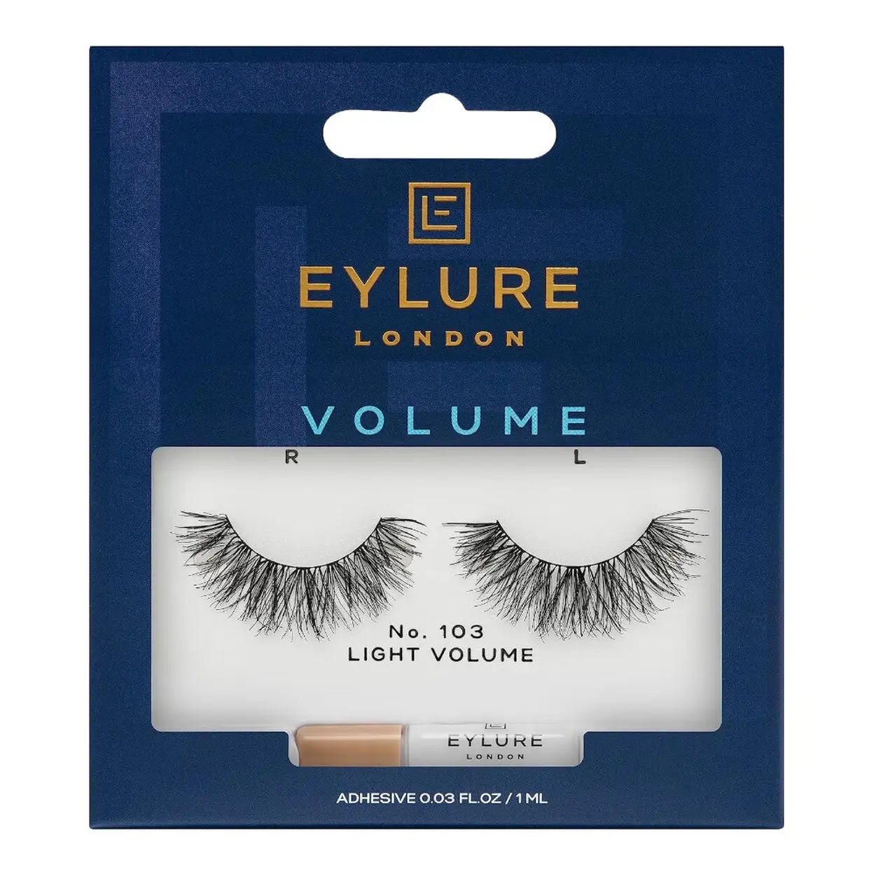 Eylure Volume False Lashes No.103 are premium handmade synthetic lashes designed to enhance your eyes with a delicate light volume effect. The ultra-lightweight fibres create a naturally fuller finish without weighing down the eyelids, making them perfect for everyday wear or special events. Each pack includes a tube of latex-free lash glue that ensures secure, comfortable wear for up to 18 hours. These reusable lashes can be worn up to 5 times when carefully removed and stored, offering great value. They are contact lens friendly and suitable for most eye shapes, providing an effortless way to achieve glamorous, defined eyes. The even length of hairs across the lash band provides you with volume and an eye-enhancing curl.