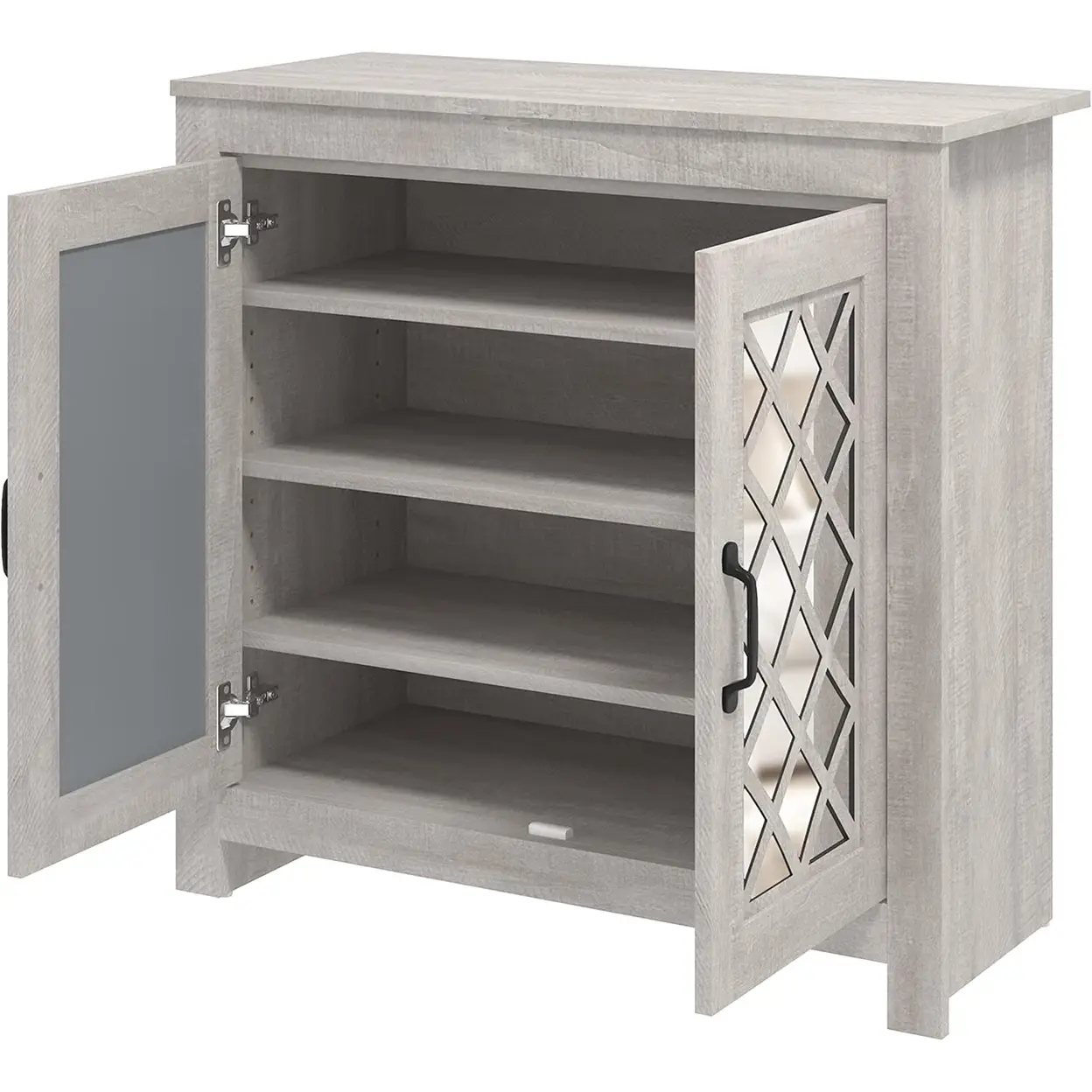 • Includes two acrylic mirror doors with decorative lattice pattern, adding elegance; adjustable shelf for customized storage.
