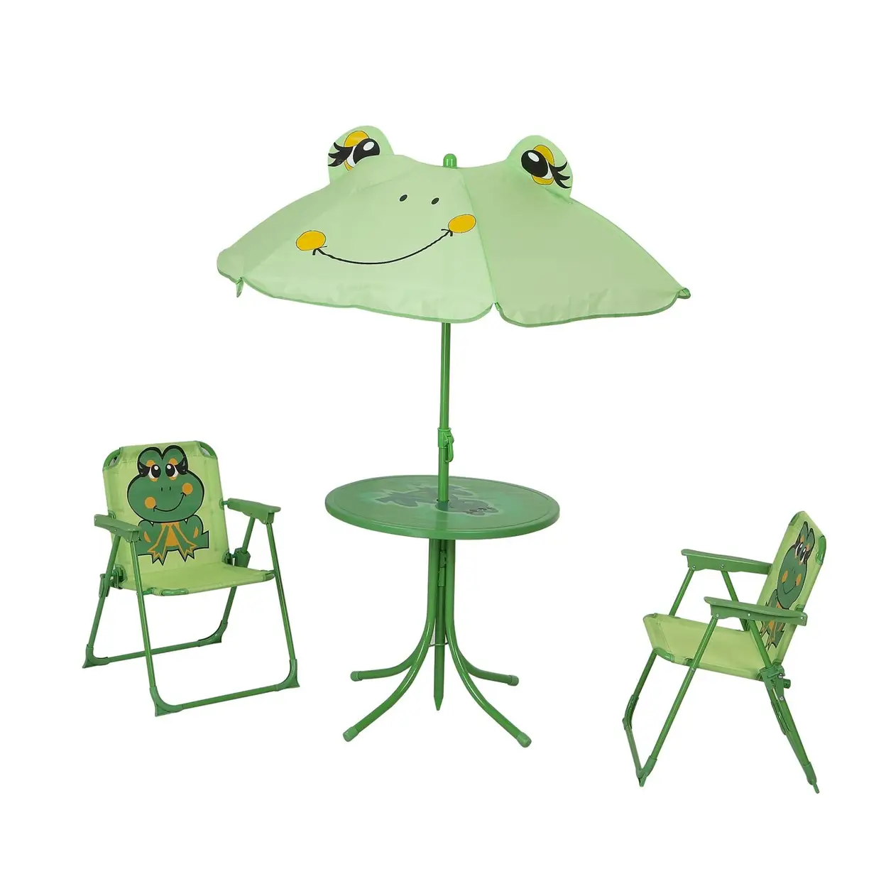 Complete 4-Piece Set: Includes 2 folding kids' chairs, 1 round side table, and 1 matching frog-themed patio umbrella, offering everything for a child's outdoor seating area.