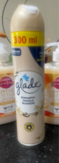 Fill your home with the warm and inviting scent of Glade Romantic Vanilla Blossom Aerosol Air Freshener. This product is designed to tackle tough odours while delivering a romantic blend of vanilla blossom, white orchids, and sandalwood. Expertly crafted by master perfumers and infused with essential oils, it freshens any room instantly, creating a cozy and elegant atmosphere.