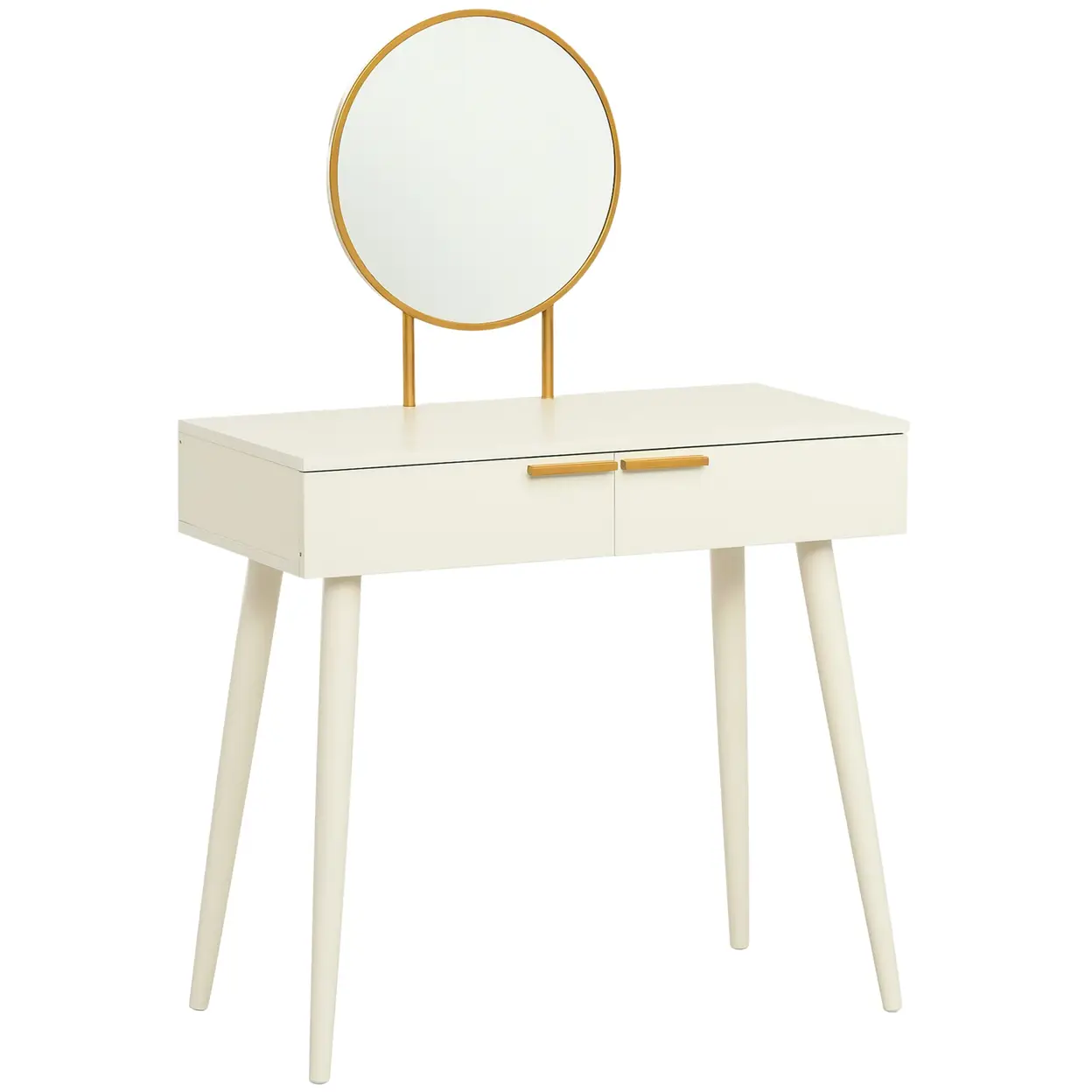 You will find everything you need in this HOMCOM dressing table: elegance, storage and comfort. Two sliding drawers for easy storage of cosmetics, brushes and other products. The table top is flat and large for extra holding room, with a large round mirror for you to get ready. The space beneath the table provides plenty of room for your legs, so you never feel cramped.