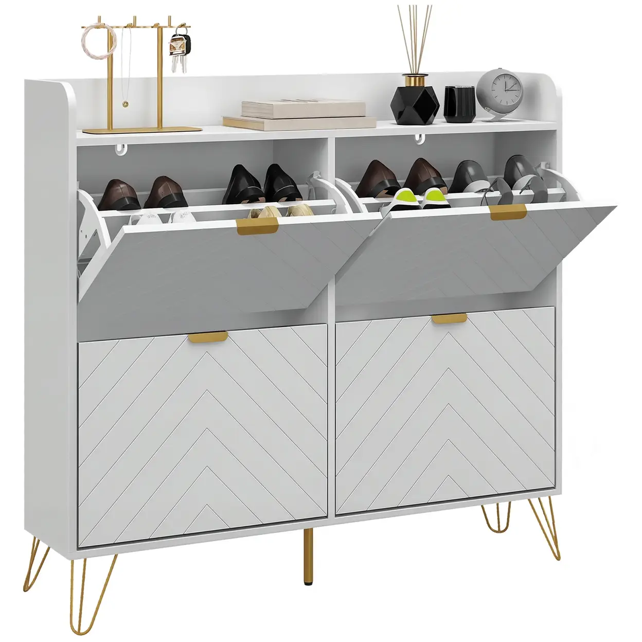 Safeguard footwear with this HOMCOM slim shoe cabinet. Features four flip drawers with adjustable shelves for flexibility. A flat top offers more storage and display room. Complete with powder coated steel legs for strong support.
