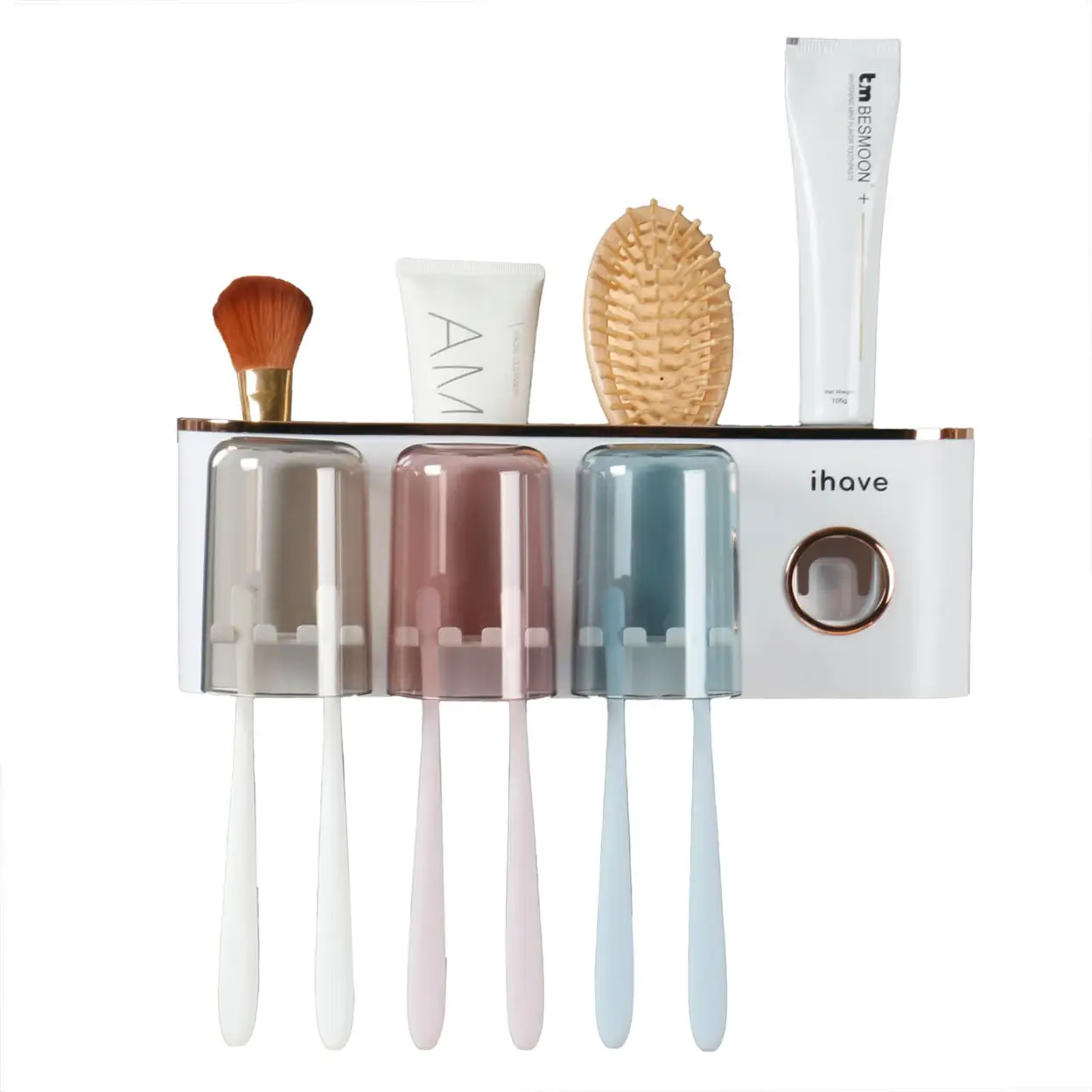 Features an integrated toothpaste dispenser for waste-free squeezing and includes 3 upside-down cups that provide dust-proof and waterproof protection.