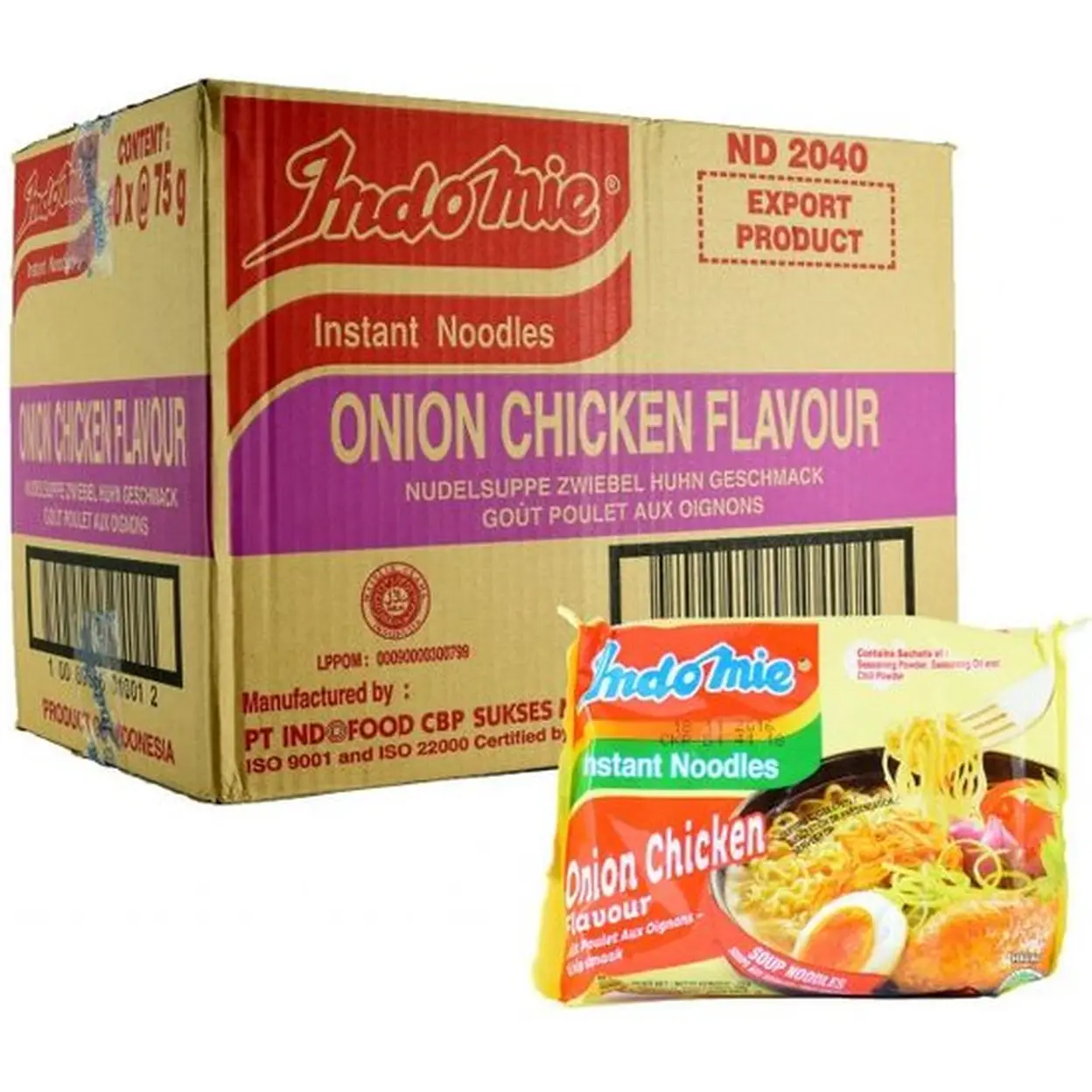 IngredientsNoodles: wheat flour (70%), refined palm oil (contains antioxidant E319), salt, acidity regulators (E451, E501, E500), thickener (E412), colour (E101) Seasoning Powder: Salt, sugar, flavour enhancers (E621, E627, E631), pepper, garlic, yeast extract, leek, onion powder, acidity regulator (E330), artificial chicken flavour (1.0%) Seasoning Oil: Refined palm oil (contains antioxidant E319), onion (0.1%) Chilli Powder