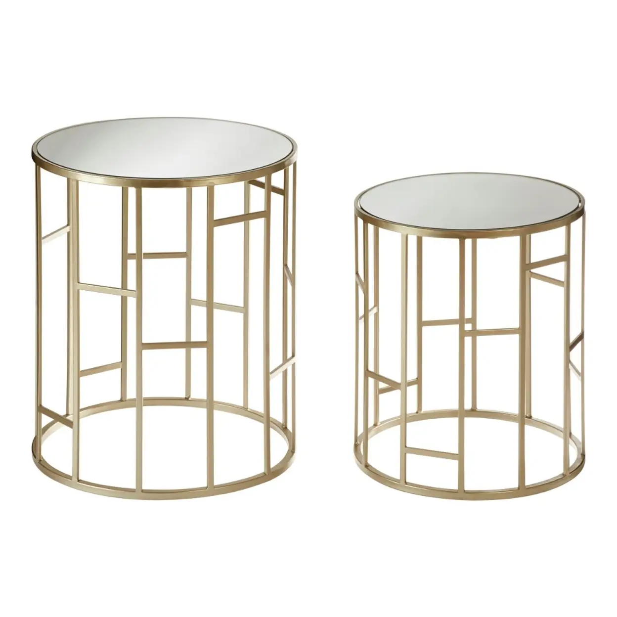The warm champagne tone of the iron frame complements metallic décor while softening modern interiors. Each tabletop is inset with mirrored glass, offering a reflective surface that adds light, space, and dimension to your living room, hallway, or bedroom. The combination of curved lines and geometric detailing makes these tables ideal as standalone accent pieces or functional companions to a sofa or armchair.