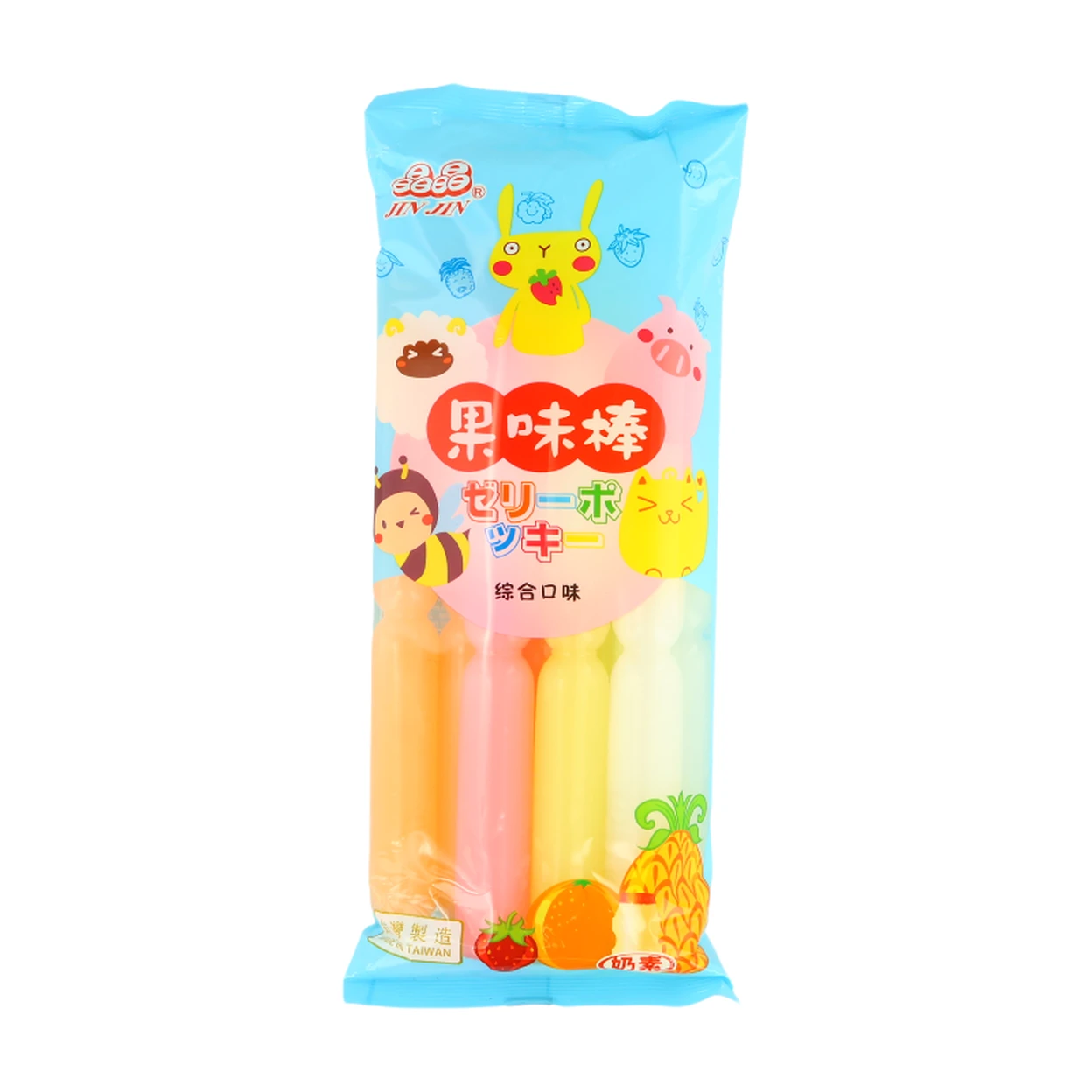 Water, White Granulated Sugar, Skimmed MILK Powder, Stabilizer (E466), Acidity Regulator (E330), Gelling Agent (E412), Artificial Orange Flavor, Artificial Pineapple Flavor, Artificial Strawberry Flavor, Artificial Yogurt Flavor, Sweetener (Sucralose - E955), Preservative (Sodium Benzoate - E211), Colors (Tartrazine - E102, Sunset Yellow - E110, Allura Red - E129).
