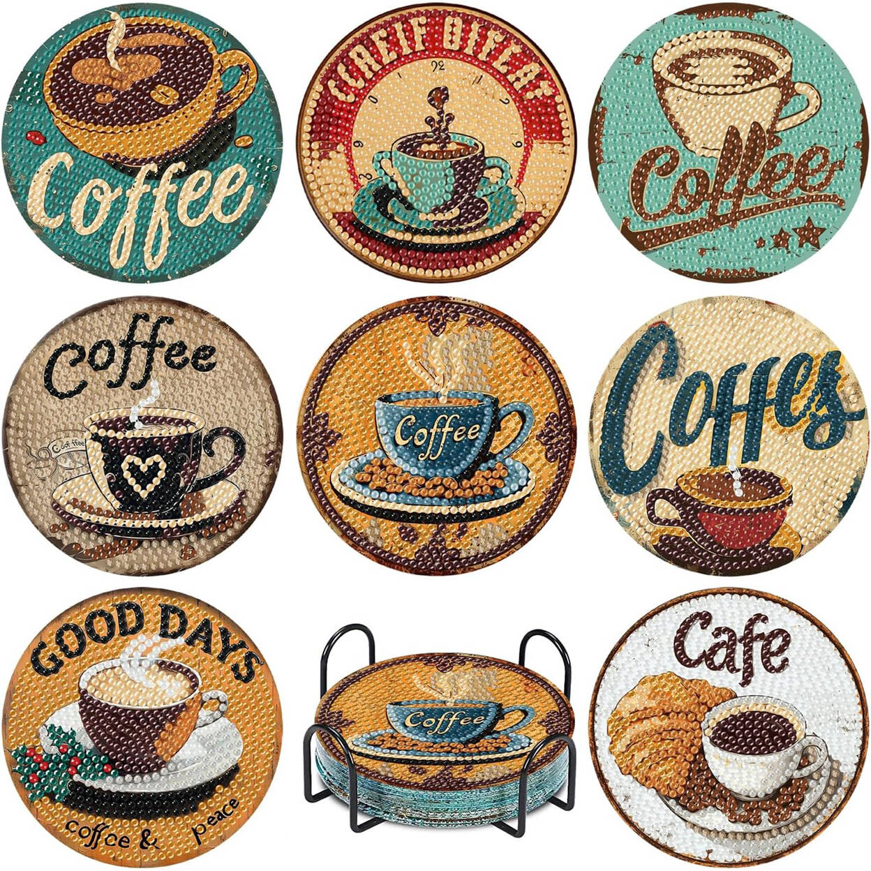 JU7CER Coffee Diamond Painting Coaster Set - 8-Piece Art Coasters with Stand | Adult DIY Craft 4×4 Inches (10×10cm)