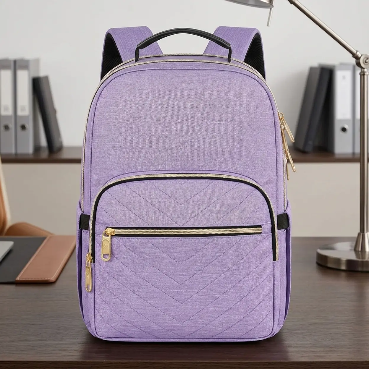 This women's laptop backpack is designed for both style and practicality. It features a separate, padded compartment for laptops up to 15.6 inches, a main storage area for books and files, and multiple organizational pockets for small items. The unique design includes a detachable keychain hook and a specialized side pocket for quick access to tissues. It is an ideal companion for school, university, work commutes, business trips, travel, and everyday casual use, combining security features with everyday functionality.
