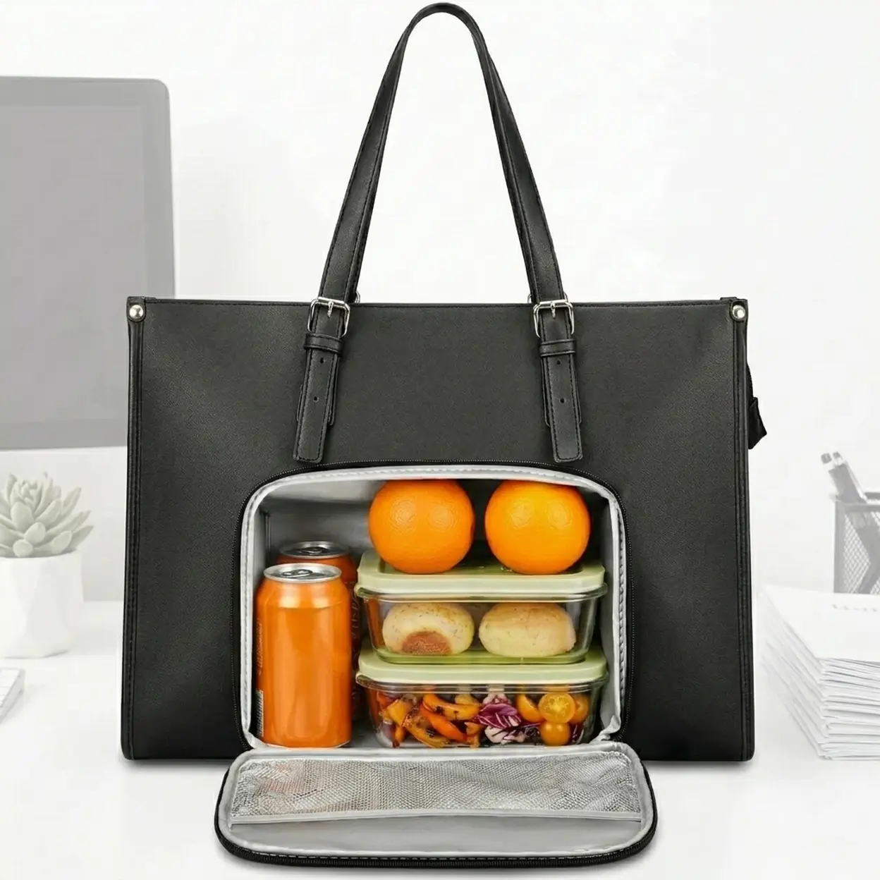 Laptop Bag Women with Insulated Lunch Compartment, Laptop Handbag 15.6 Inch, Work Bag Women Large, Briefcase Waterproof, Shopper Bag Leather, Shoulder Bag for Business, School, Black, New Year Sale , Top gift picks