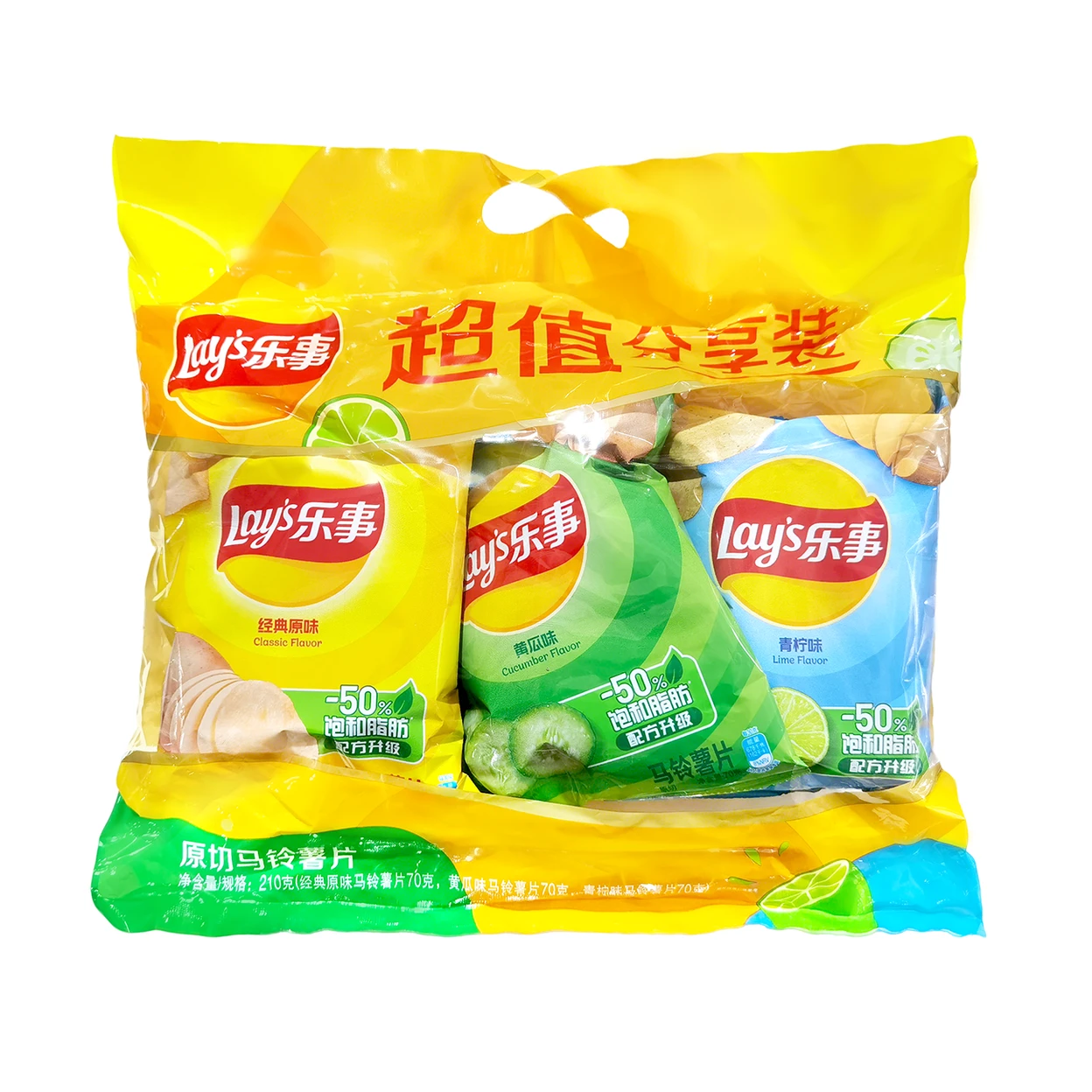 Assortment pack featuring three classic Lay’s flavors: Original, Cucumber, and Lime