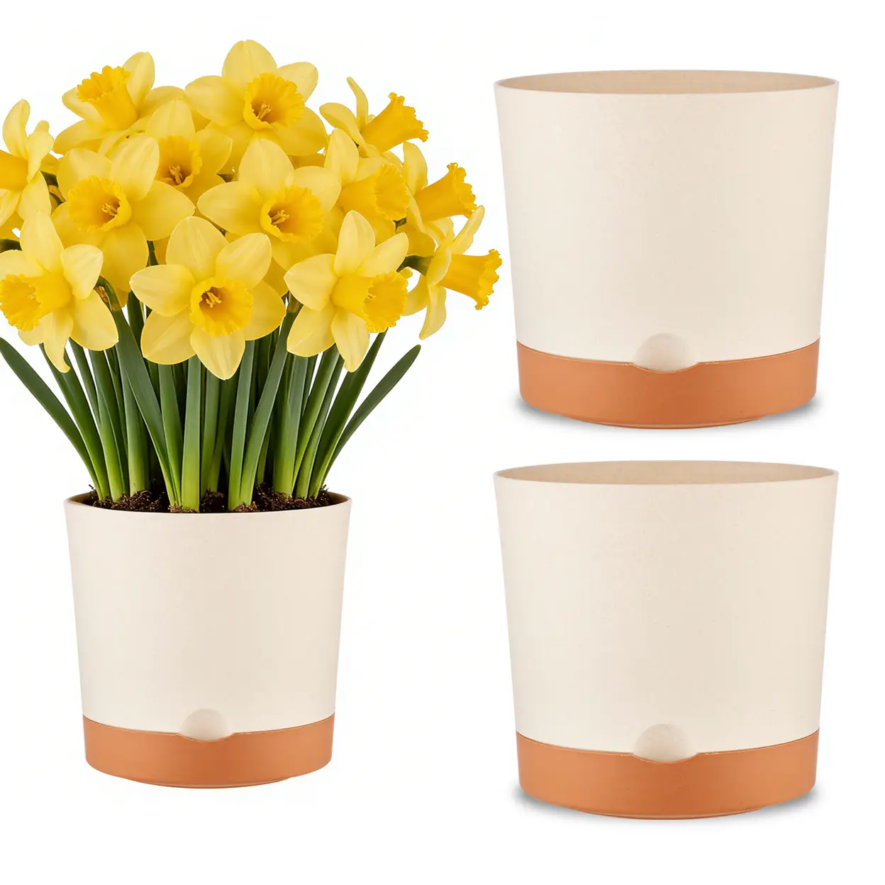 The MADLAND Self-Priming Flower Pot Set features a modern, minimalist beige design that blends seamlessly into any indoor or outdoor decor. The set's coordinated look and practical self-priming design make it both a decorative element and a functional solution for plant care.