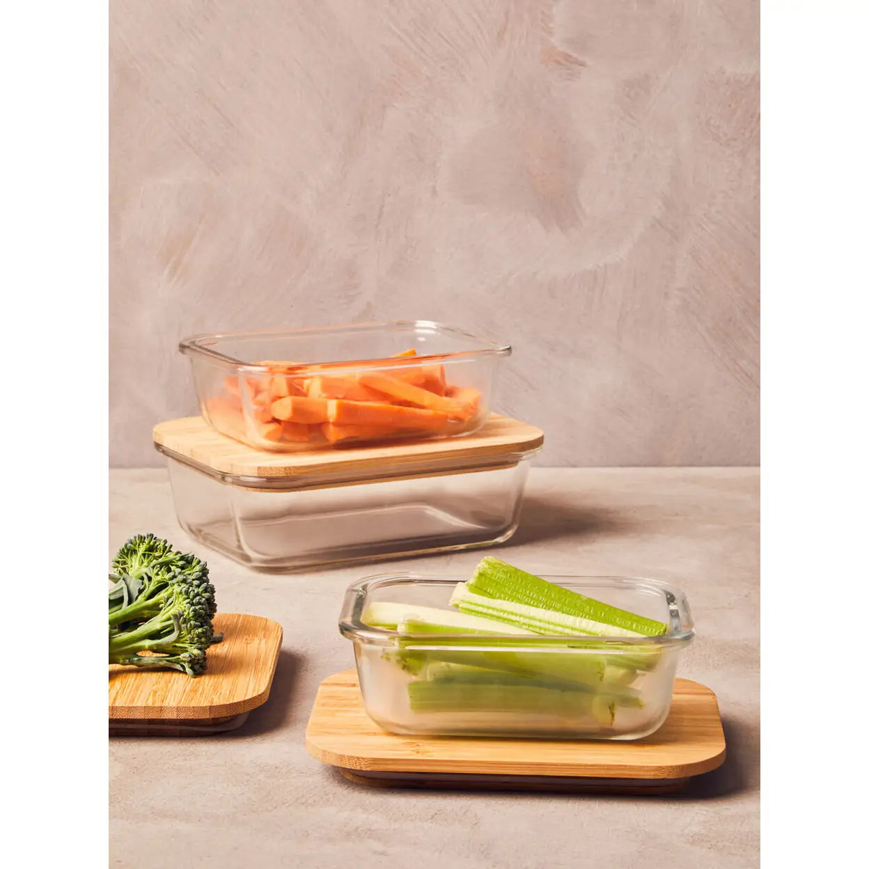 Use the container to store a variety of foods, ensuring the bamboo lid is securely in place to maintain the airtight seal. The glass container is suitable for use in the oven (without the lid) for reheating or cooking. Clean the glass by hand washing or in the dishwasher, and wipe the lid with a damp cloth to maintain its natural finish.