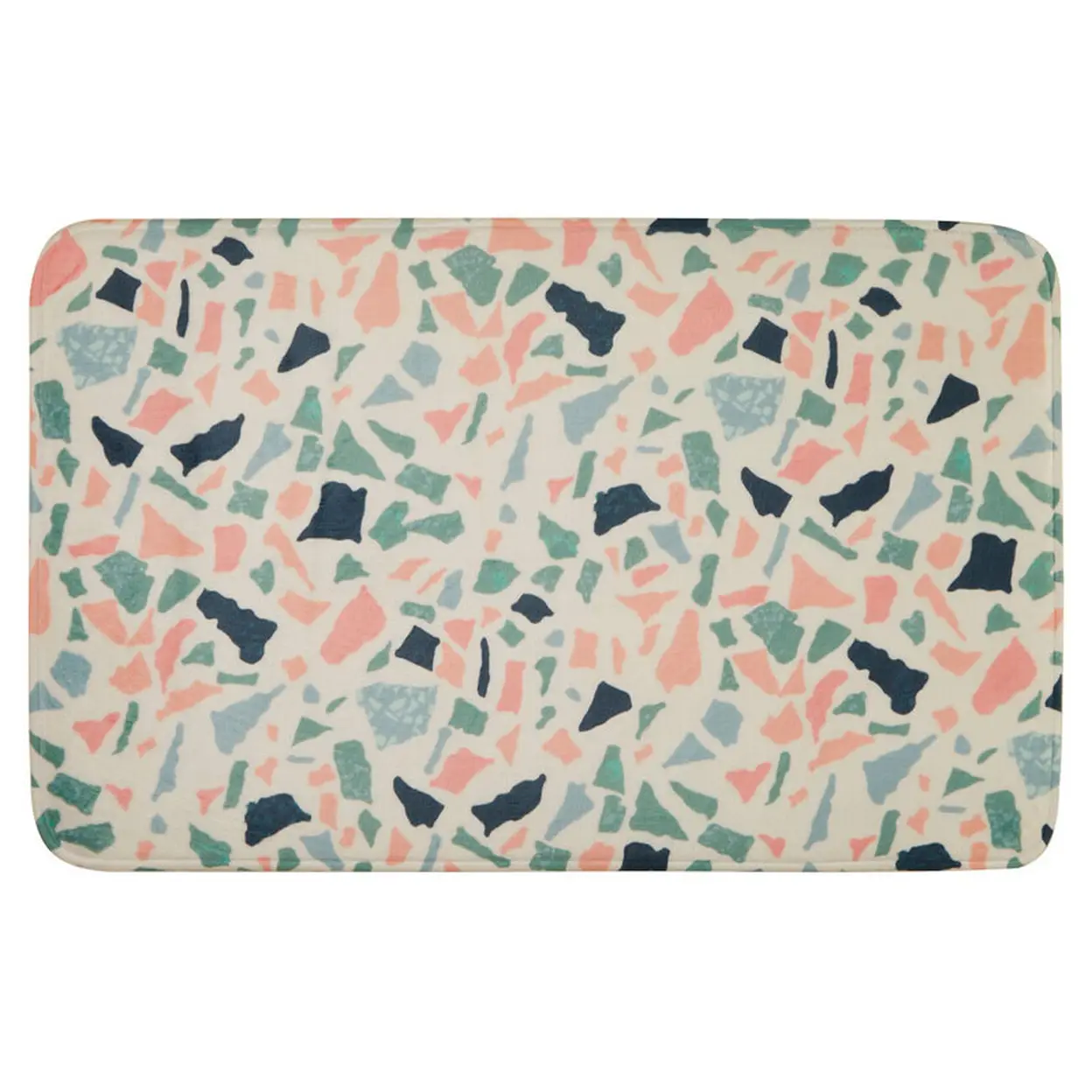 This rectangular bath mat combines form and function with its vibrant terrazzo design in pastel shades, adding a welcoming accent to any modern bathroom. The highly absorbent microfiber surface efficiently captures moisture, ensuring your bathroom stays dry and clean. Its quick-dry properties help maintain freshness and hygiene. The skid-proof backing provides a non-slip surface, keeping the mat securely in place for added safety. Perfect for everyday use, this mat not only enhances the aesthetic of your bathroom with its gentle palette but also offers practicality and style, making it a versatile addition to your home decor.