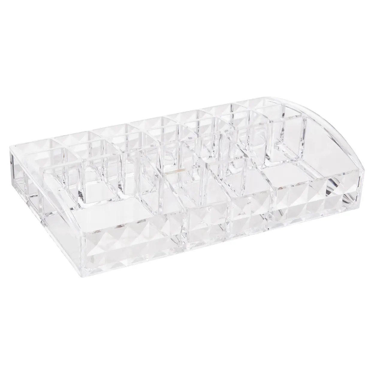 Enhance your beauty organization with this stylish diamond-cut cosmetic organizer, designed to keep your makeup products neatly arranged and easily accessible. With its elegant diamond cut detail, this organizer adds a sophisticated touch to any vanity or bathroom counter. It features twenty compartments, providing ample storage space for a wide range of cosmetics, from lipsticks and eyeliners to brushes and palettes. The sturdy yet lightweight construction ensures durability without sacrificing ease of handling, making it simple to move and place wherever needed. The versatile design allows it to be used for organizing other items as well, offering a multifunctional solution for decluttering your space. Keep your everyday makeup products close at hand and beautifully displayed with this chic and practical organizer.