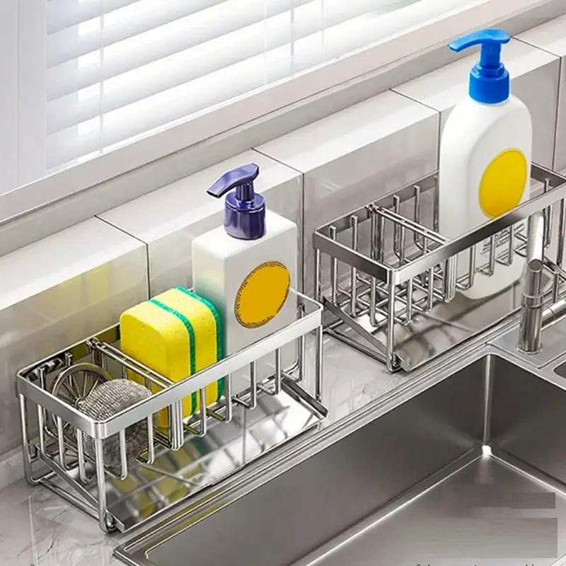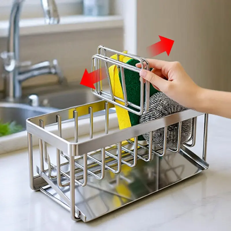 Multi-Functional Organization: Integrates storage for sponges, scrub brushes, and a built-in soap dispenser, neatly containing essential sink-side items.