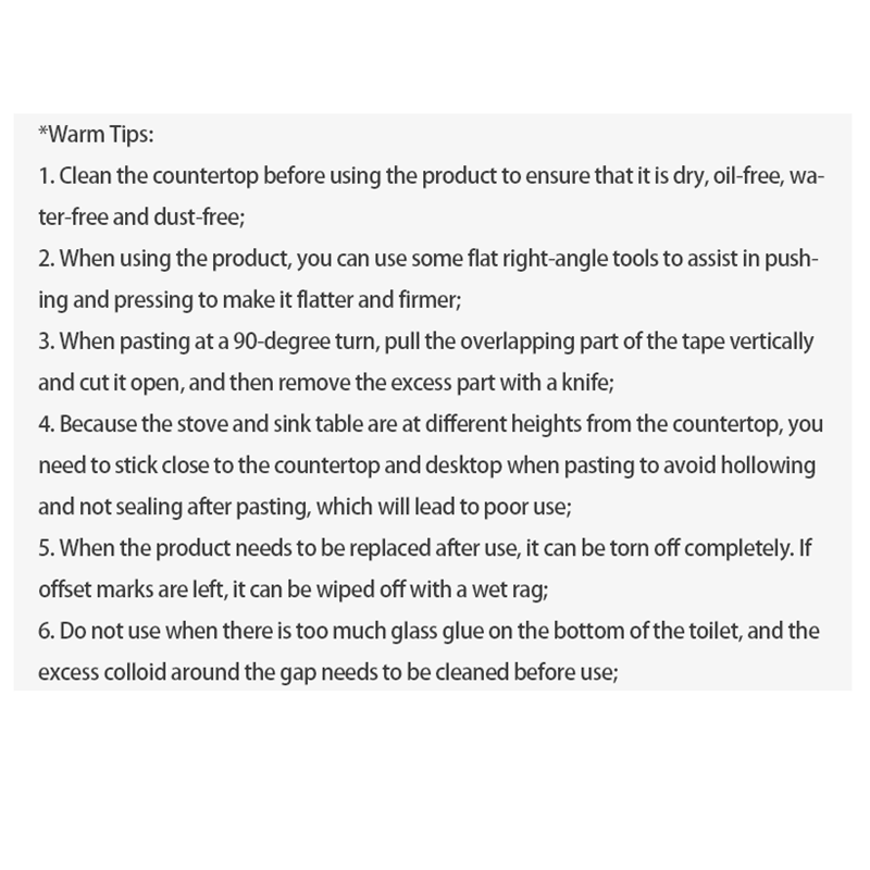 Clean and dry the surface before pasting; press firmly for better adhesion; store in a cool dry place.
