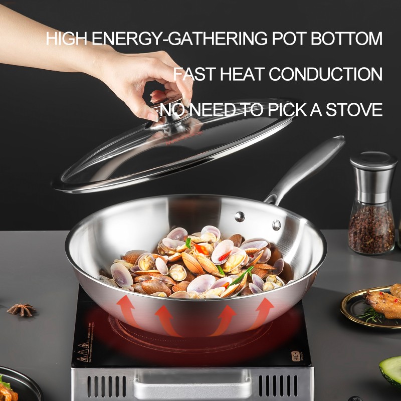 This cookware is crafted from selected 304 stainless steel, known for its high-temperature resistance and corrosion resistance, ensuring a healthier cooking experience by not releasing metal ions. The material is not prone to rust and is easy to clean. It features a thick sole and thin walls for uniform heat distribution, with a multi-layer composite substrate that enhances energy absorption and efficiency, resulting in a longer service life. The surface is polished and ground to a smooth finish, reducing food residue adhesion for easier cleaning. The anti-scratching handle has a hollow design for comfort and heat safety. The visible lid is explosion-proof and high-temperature resistant, providing durability and visibility. High-strength rivets ensure sturdiness and prevent loosening and scratching.