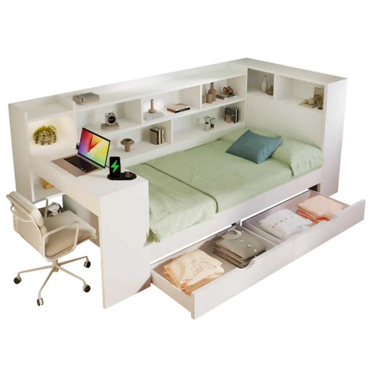 Merax Single Daybed with Bookcase & Computer Desk, 3FT Sofa Bed with Storage, Drawers & USB Type-C Port, 90 x 190 cm Multi-functional Wooden Bed Frame for Living Room/ Bedroom, White (No Mattress)