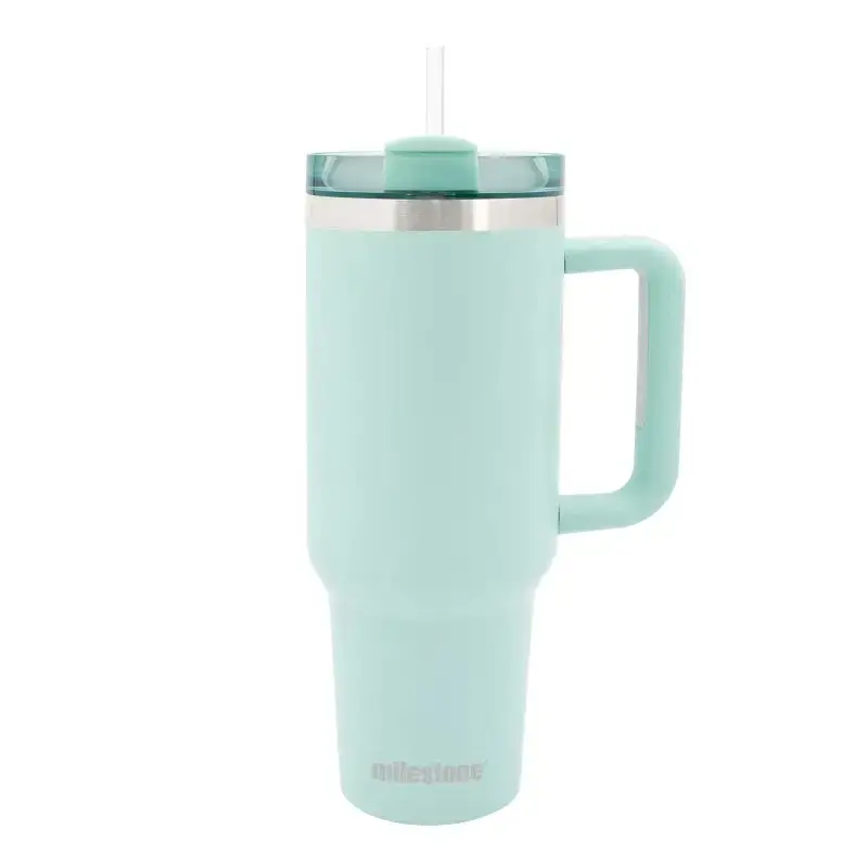 Milestone Travel Mug 40oz Tumbler with Straw, Handle & Lid/Large Capacity Insulated Stainless Steel Cup for Cold or Hot Drinks (Mint Green)