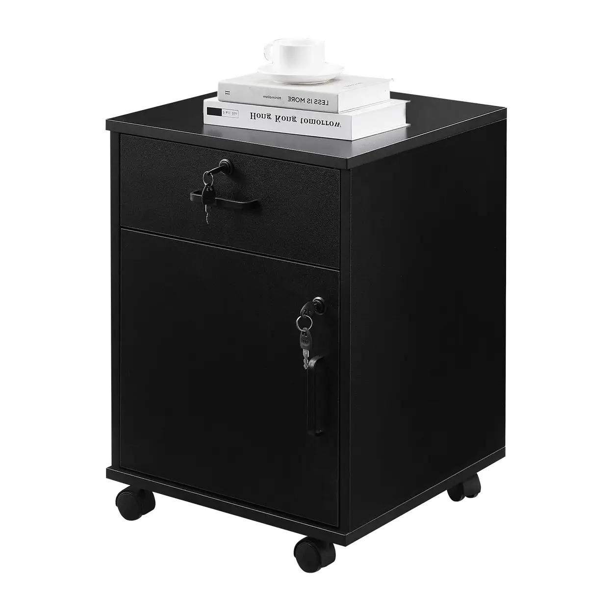 Mobile File Cabinet with Lockable Drawer & Door, Under Desk Rolling Filing Cabinet with 4 Wheels, Wooden Stationery Storage Cabinet for Home Office Black