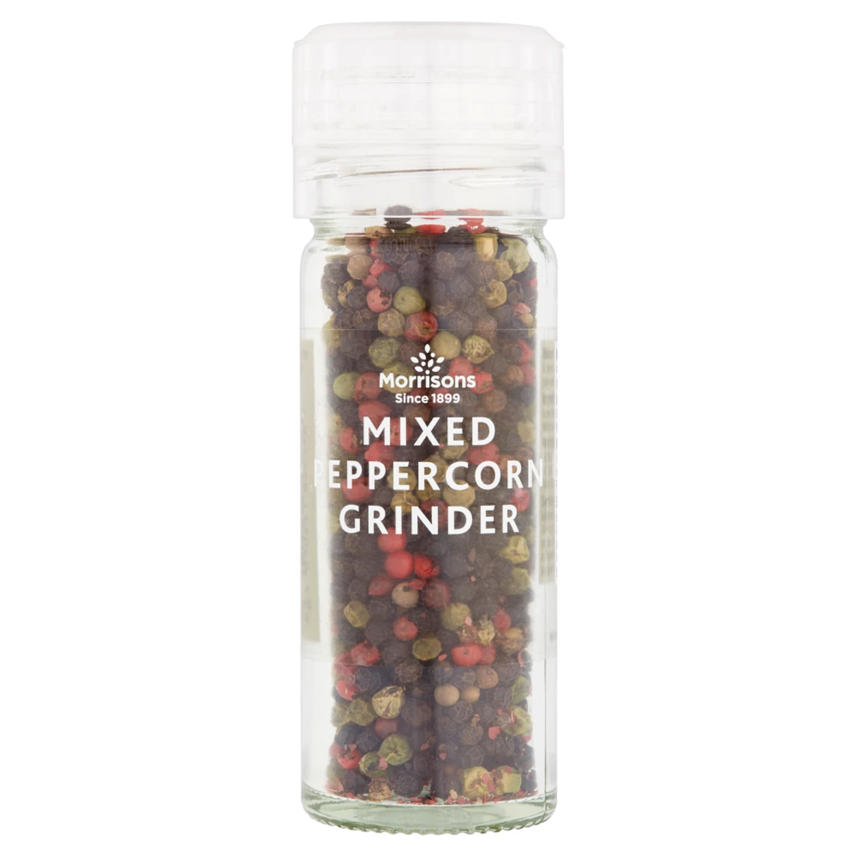 Ingredient variety: A colorful blend of whole black, green, pink, and white peppercorns.