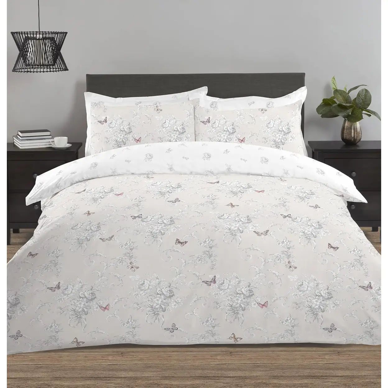 Introducing the Vanessa Reversible Duvet Cover Set, an elegant and timeless bedding choice designed to elevate your bedroom with classic charm. Featuring a traditional toile-inspired floral design, the front of the duvet cover is beautifully detailed with delicate butterflies set against a sophisticated greyscale floral background, creating a refined yet eye-catching look.