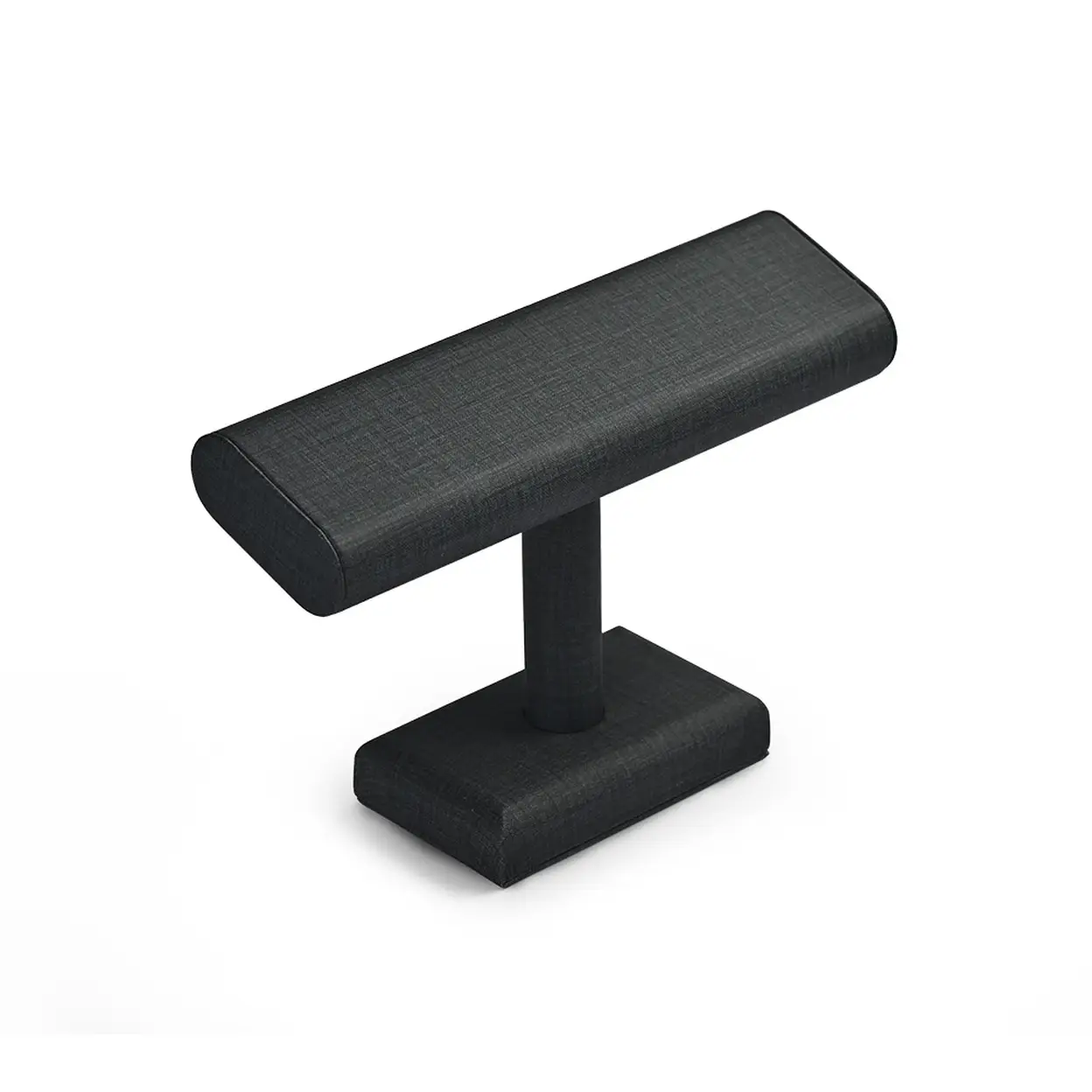 This jewelry display stand is crafted from luxury leather with a linen-like texture and features a solid weighted base, offering durability and a soft, protective watch resting bar to prevent scratches.