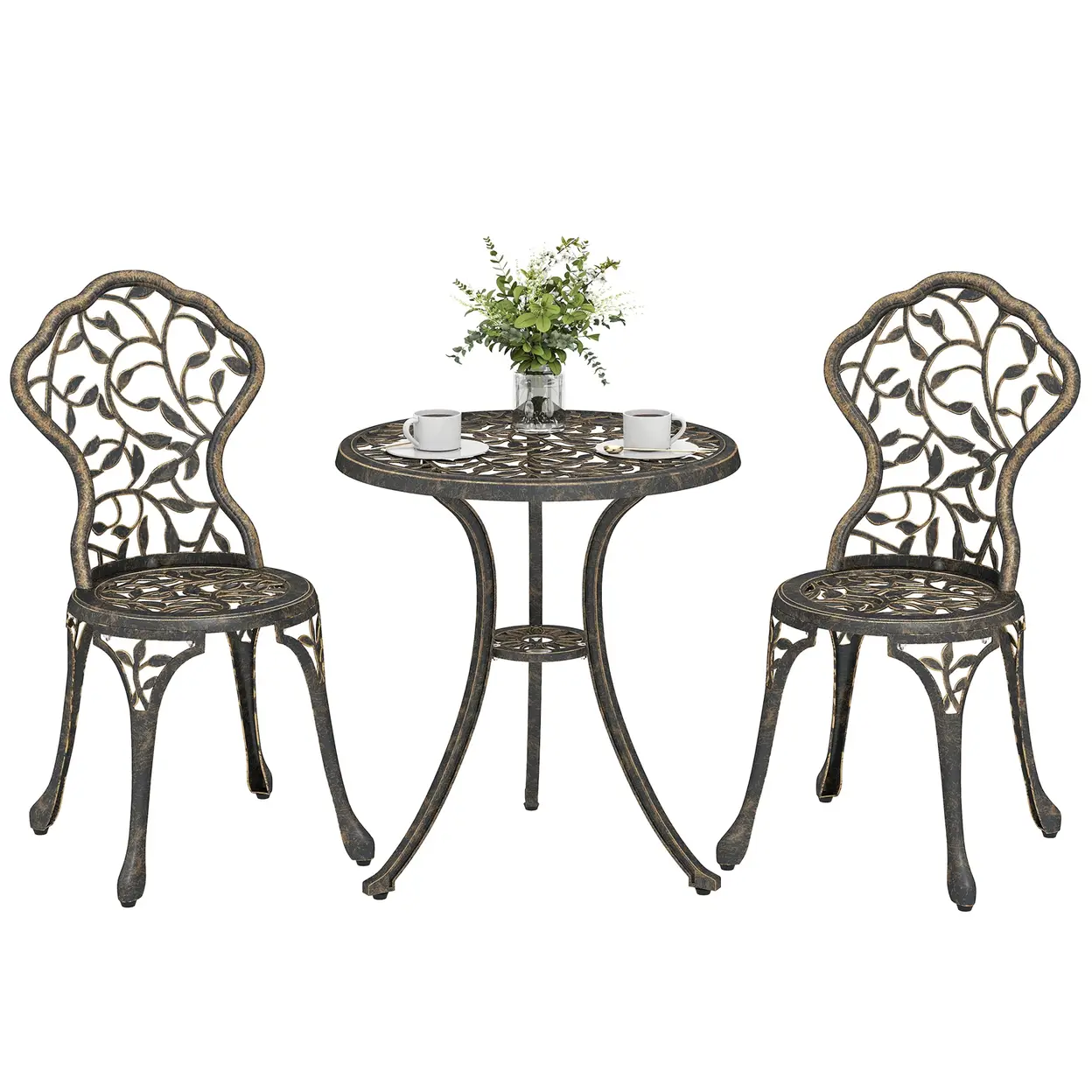 This Outsunny outdoor bistro set is for practically every outdoor space. The cut-out leaf design is pretty and elegant. Made from aluminium, the frames are strong, supportive you when you sit and relax. The metal is also resistant to peeling and corrosion for prolonged wear. Two chairs and a table mean you can gather round with company, wherever you choose to.● Aluminium chairs and table are strong, resistant to peeling and corrosion