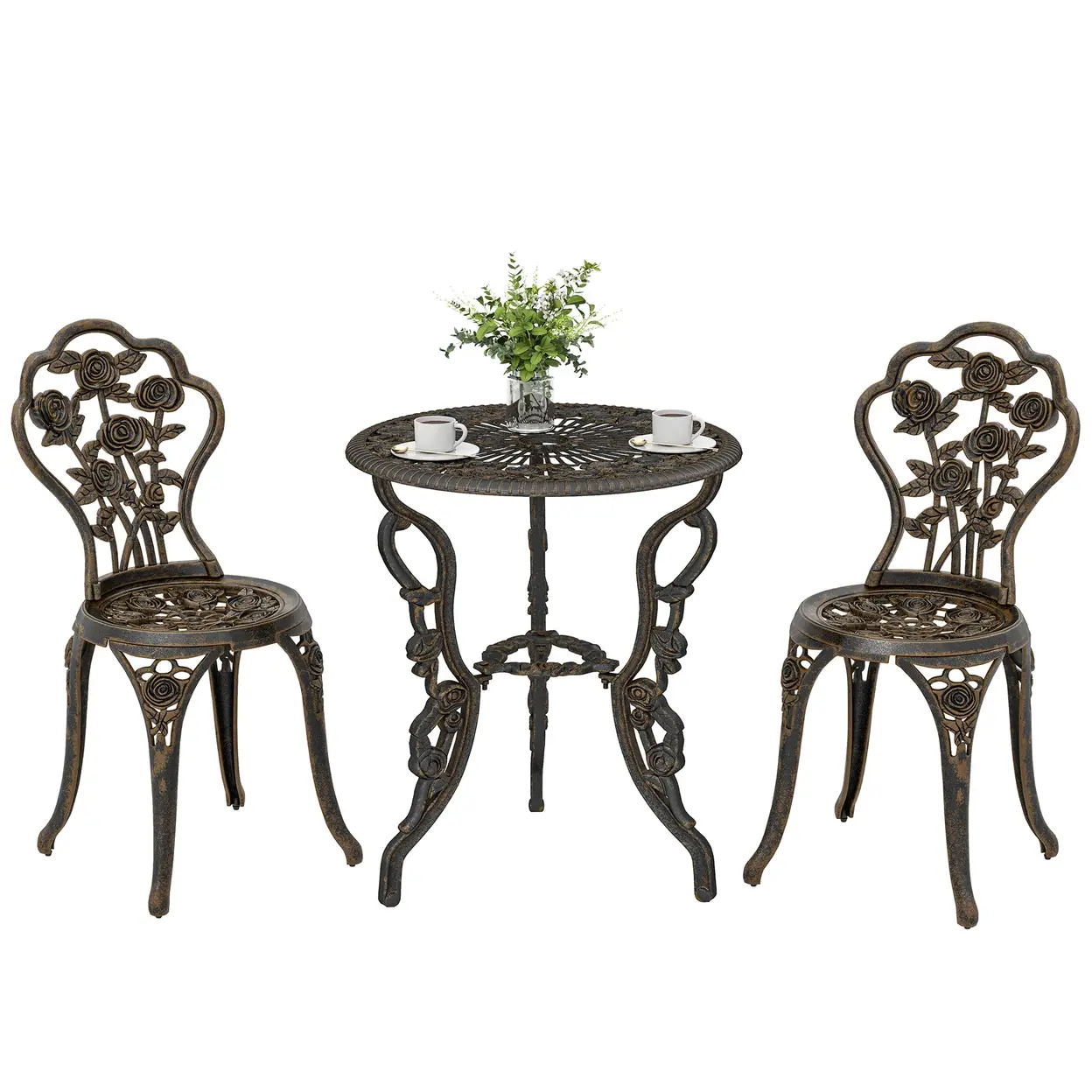 Does your garden lack a charming focal point for relaxation? The intense sun and worries about weather damage can make it hard to enjoy your space. The Outsunny bistro set offers a solution with its elegant rose design. A built-in 45 mm umbrella hole provides instant shade while its rust-resistant construction ensures lasting beauty. Create your inviting, long-lasting retreat for quiet moments with this beautiful garden bistro set for 2● This three-piece bistro set features an elegant rose pattern for a classic look