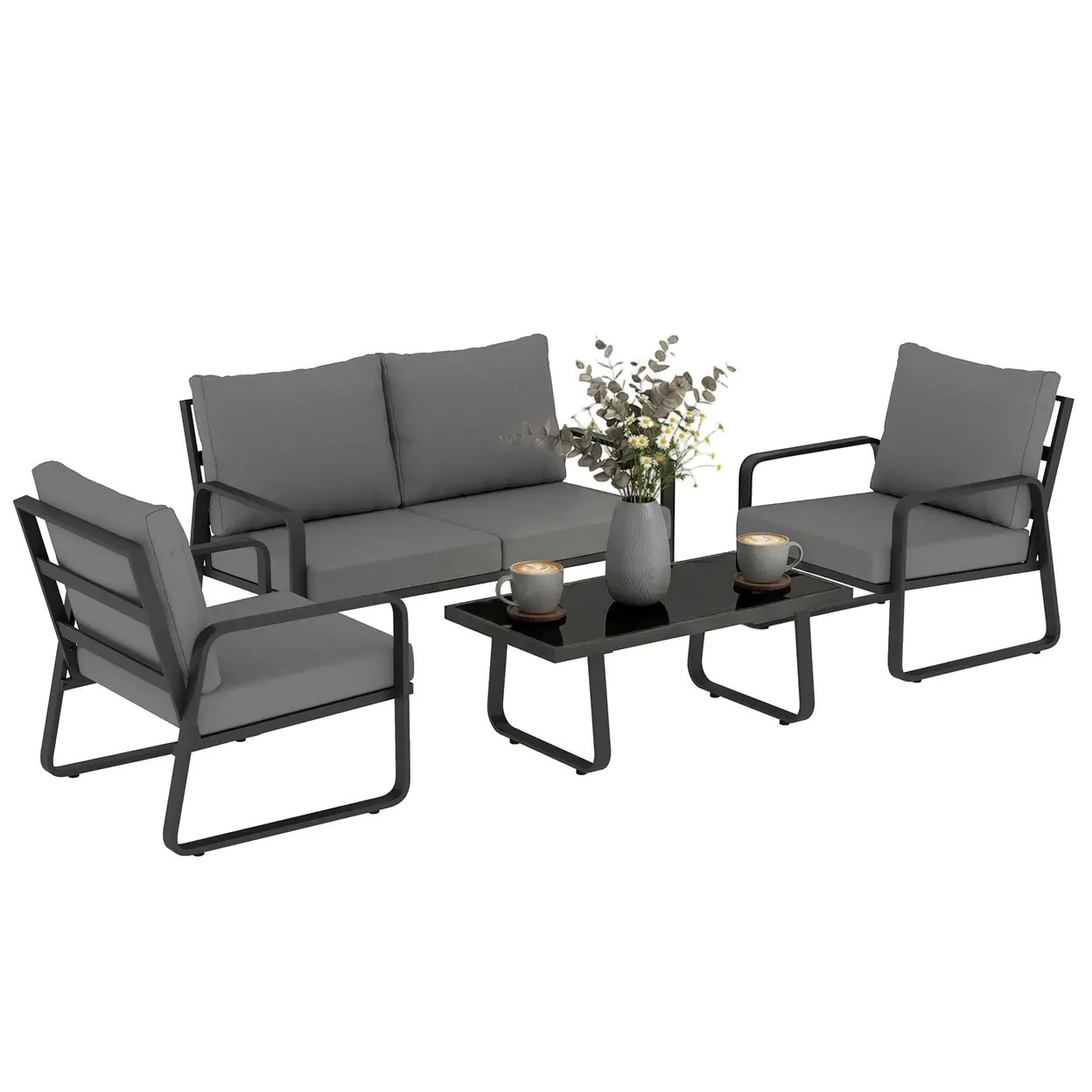 Struggling to create an inviting outdoor space? Uncomfortable seating and worries about weather damage can spoil your relaxation. This Outsunny garden sofa set offers a solution. The all-weather metal frame of the outdoor garden furniture provides a stable foundation for thick cushions, inviting you and three guests to settle in for hours of comfortable conversation, creating cherished moments in your own garden retreat.● Complete 4-piece set instantly creates a cosy conversation spot for four