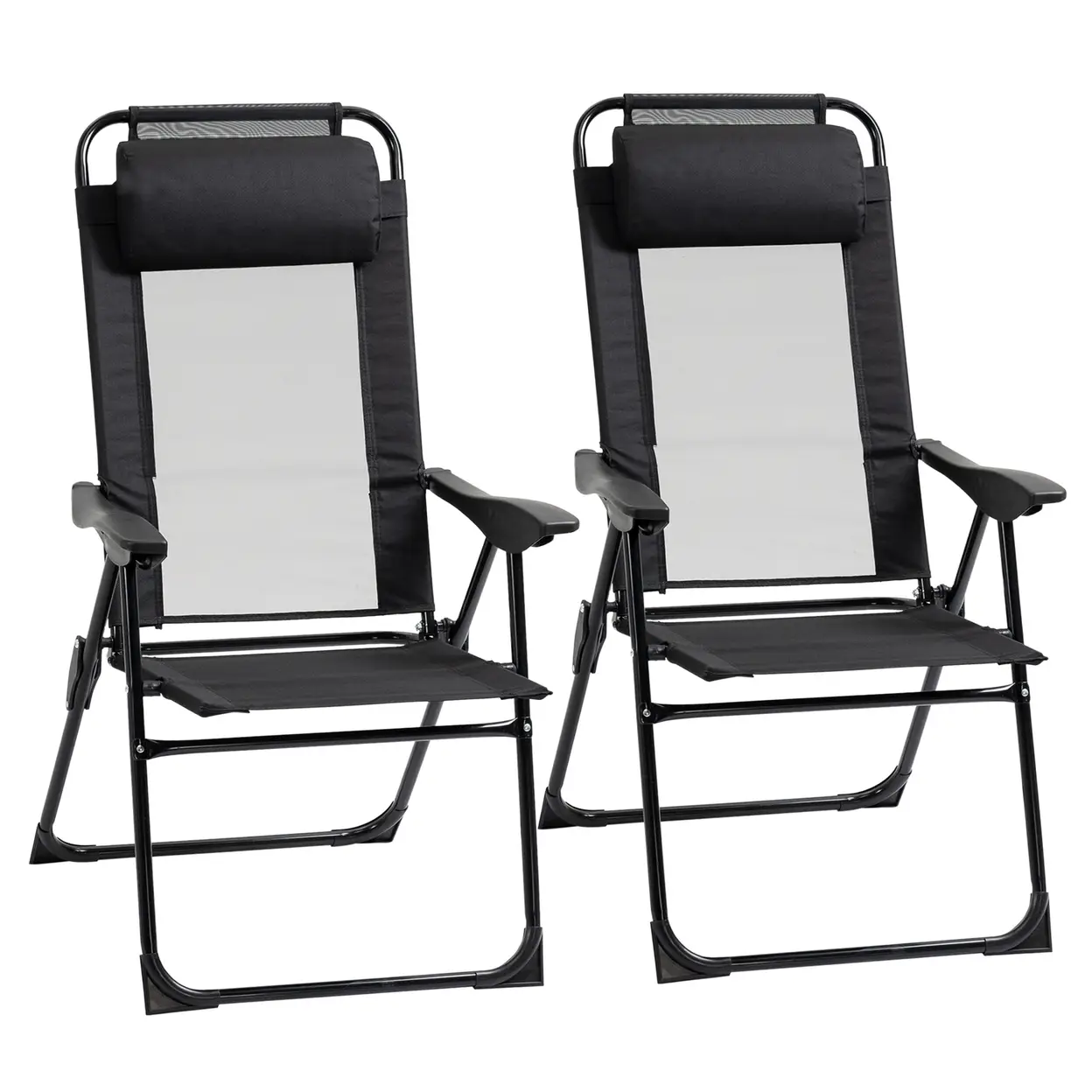 Let the stress melt away whenever with these two sun chairs from Outsunny! The duo set is great for enjoying the outdoors with a friend. The backs recline to five different positions, so you can relax the way you want. The fabric mesh weather-resistant seats are breathable, with a padded headrest for comfort and support. A foldable design, you can take these garden chairs wherever you want - whether that's around your outdoors or beyond.● Adjustable back - sets between five different positions