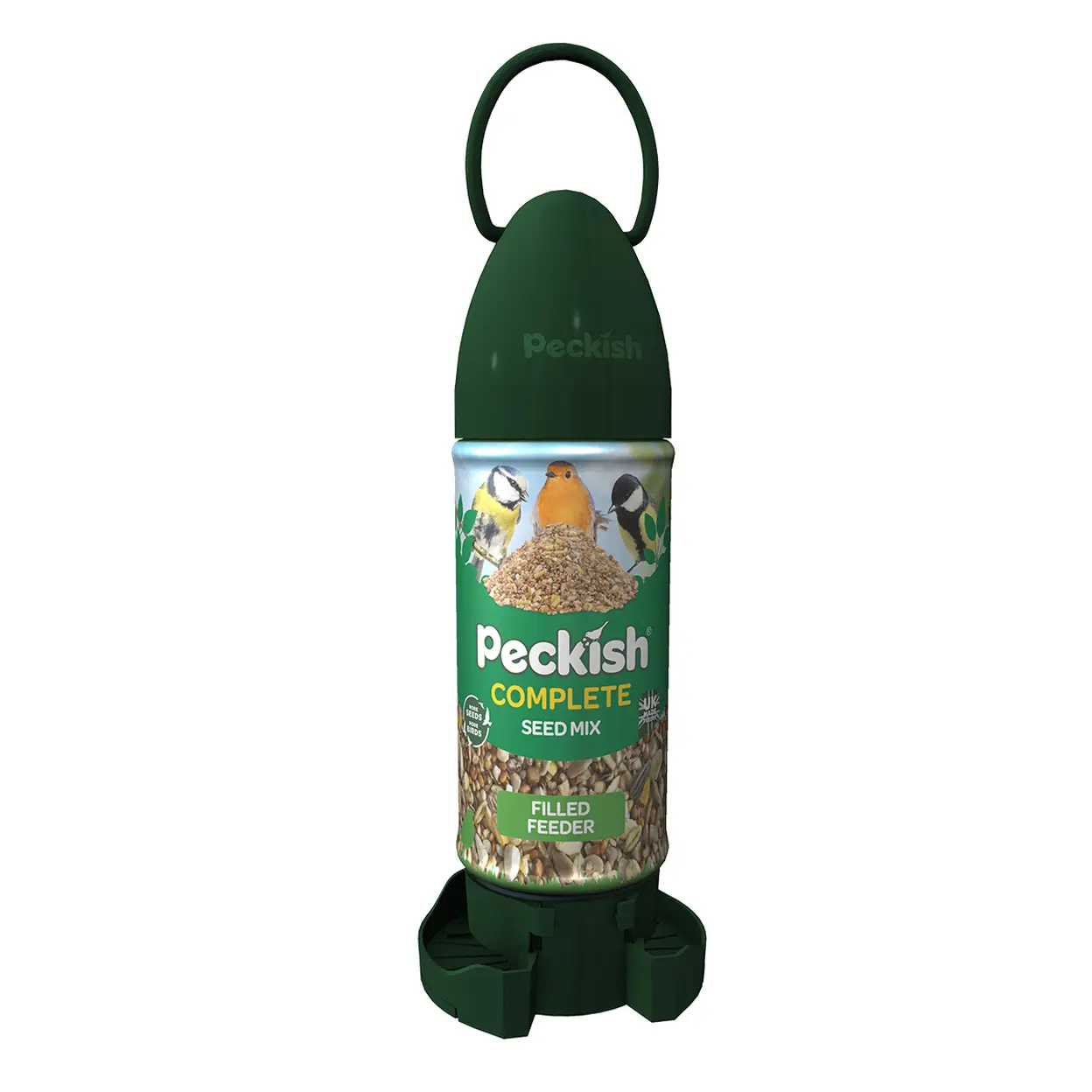 The Peckish Complete Seed Mix Feeder is an all-in-one, ready-to-use bird feeder. It comes pre-filled with a premium seed mix designed to attract common UK garden birds, featuring a clear viewing window and protective metal ports.