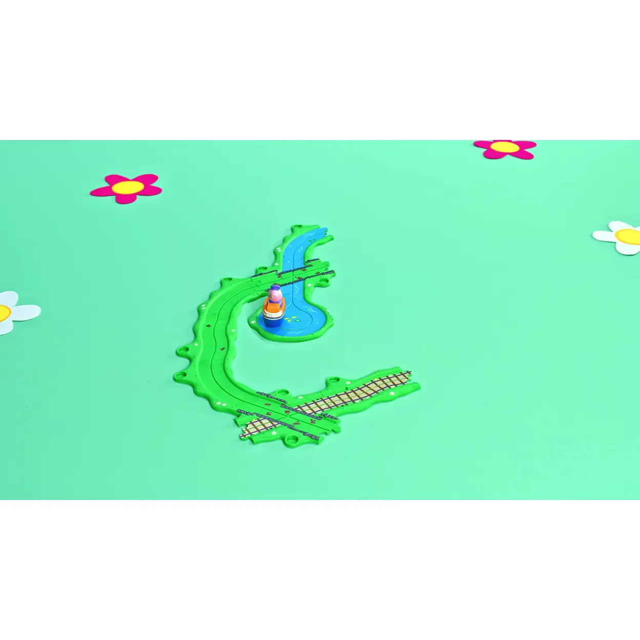 - Brightly Coloured Motorised Vehicles: Features a classic blue train with George Pig, a red car with Peppa, and a bobbing boat with Grandpa Pig. Push the top to activate and watch them go!